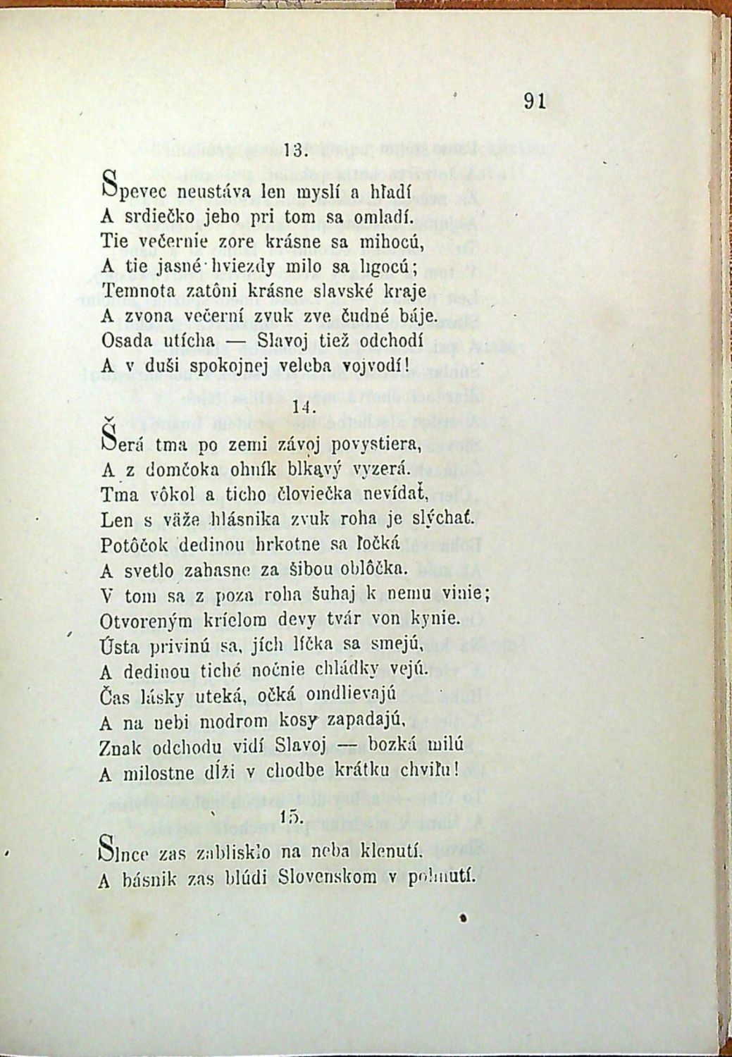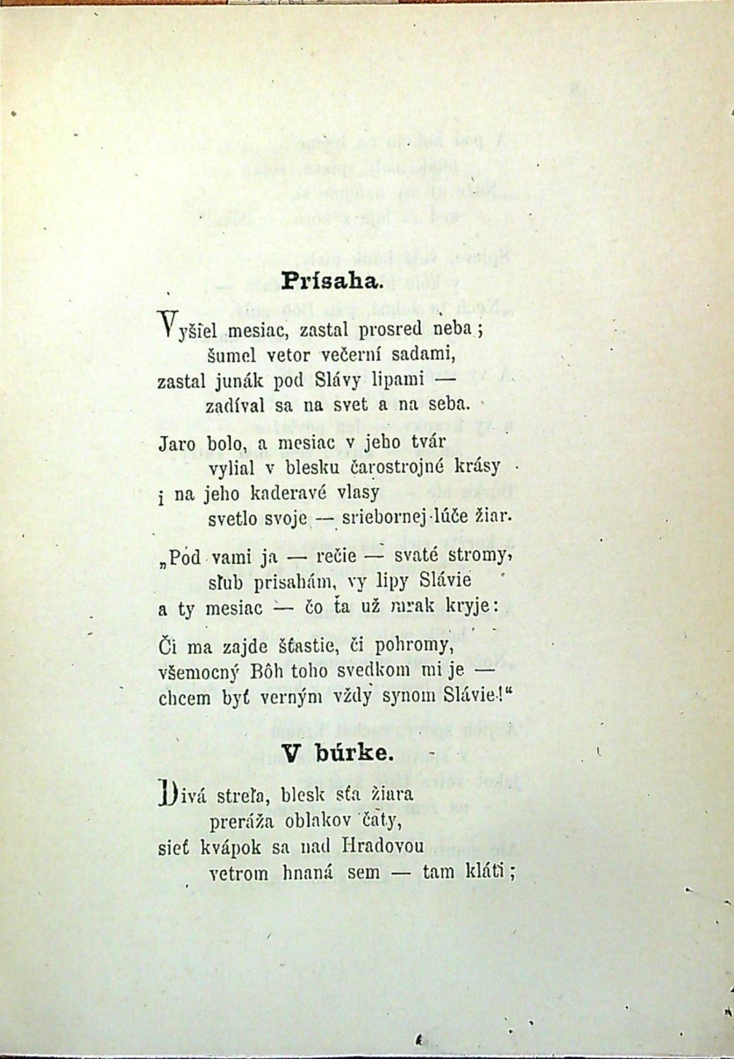 Tištěno antikvou, tučně tištěné nadpisy a plné iniciálky, dva titulní listy. Kniha vyšla jako IX. svazek "Slovensko-Národní Biblioteky".<br>Individuální polokožená vazba Otto Blažka z 30.let 20. století (na zadním přídeští vpravo dole jeho suché razítko). Kartonové desky zčásti potažené mramorovaným papírem, kožený hřbet a pokryv desek podél hřbetu, široké nárožnice (světlá hlazená vepřovice), ve hřbetu 4 vazy, při okrajích vazů ozdobné jednoduché zlacené linky, ve třech polích temně hnědé kožené štítky se jménem autora a názvy obou dílů, při spodním okraji tlačená a zlacená datace knihy, zlacená svrchní ořízka, původní pap. obálky vevázány, knižní blok neoříznutý. <br>Otto Blažek (25.4. 1906 Praha - 23.4. 1967 Praha), významný knihař a pedagog. V letech 1926-27 působil v Paříži u Théophila Stiebela, kde se přiučil technologii francouzské vazby, poté skoro dva roky působil u Pierra Legraina, ve své době nejvýznamnějšího francouzského ateliéru věnujícího se luxusní vazbě nejvyšší umělecké úrovně. <br>Gustáv Lojko, publikující pod jménem Hostivít Lojko Tisovský (4.12. 1843 Tisovec - 2.6. 1871 Revúca) básník a pedagog, od roku 1866 až do své smrti působil jako profesor na "Prvom slovenskom gymnáziu" v Revúci, kde vyučoval slovenštinu, němčinu, latinu a řečtinu.