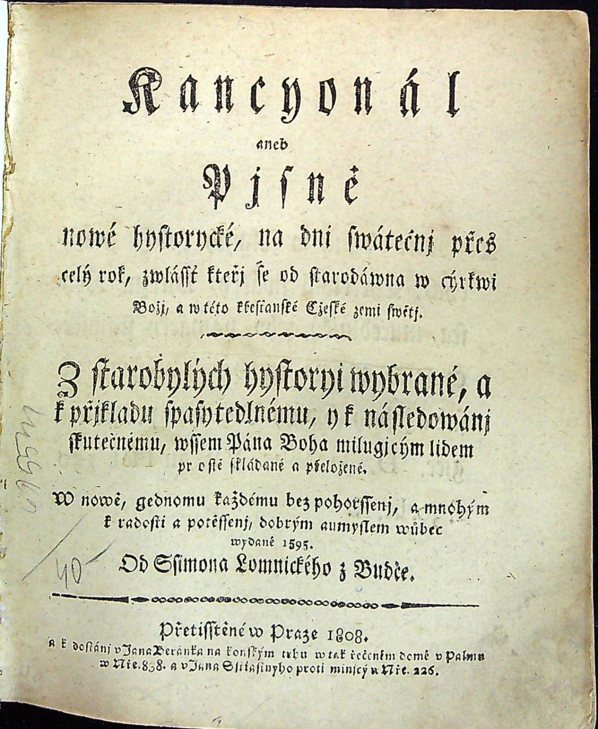 Kancyonál aneb Pjsně nowé hystorycké, na dni swátečnj přes celý rok, zwlássť kteřj se od starodáwna w cýrkwi Božj, a w této křesťanské Cžeské zemi swětj. Z starobylých hystoryi wybrané, a k přjkladu spasytedlnému, y k následowánj skutečnému, wssem Pána Boha milugjcym lidem ..prostě skládané a přeložené. W nowě, gednomu každému bez pohorssenj, a mnohým k radosti a potěssenj, dobrým aumyslem wůbec wydané 1595 Od