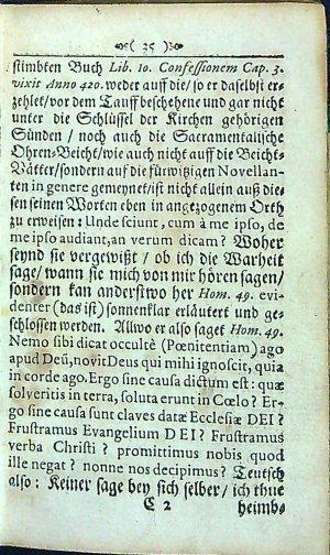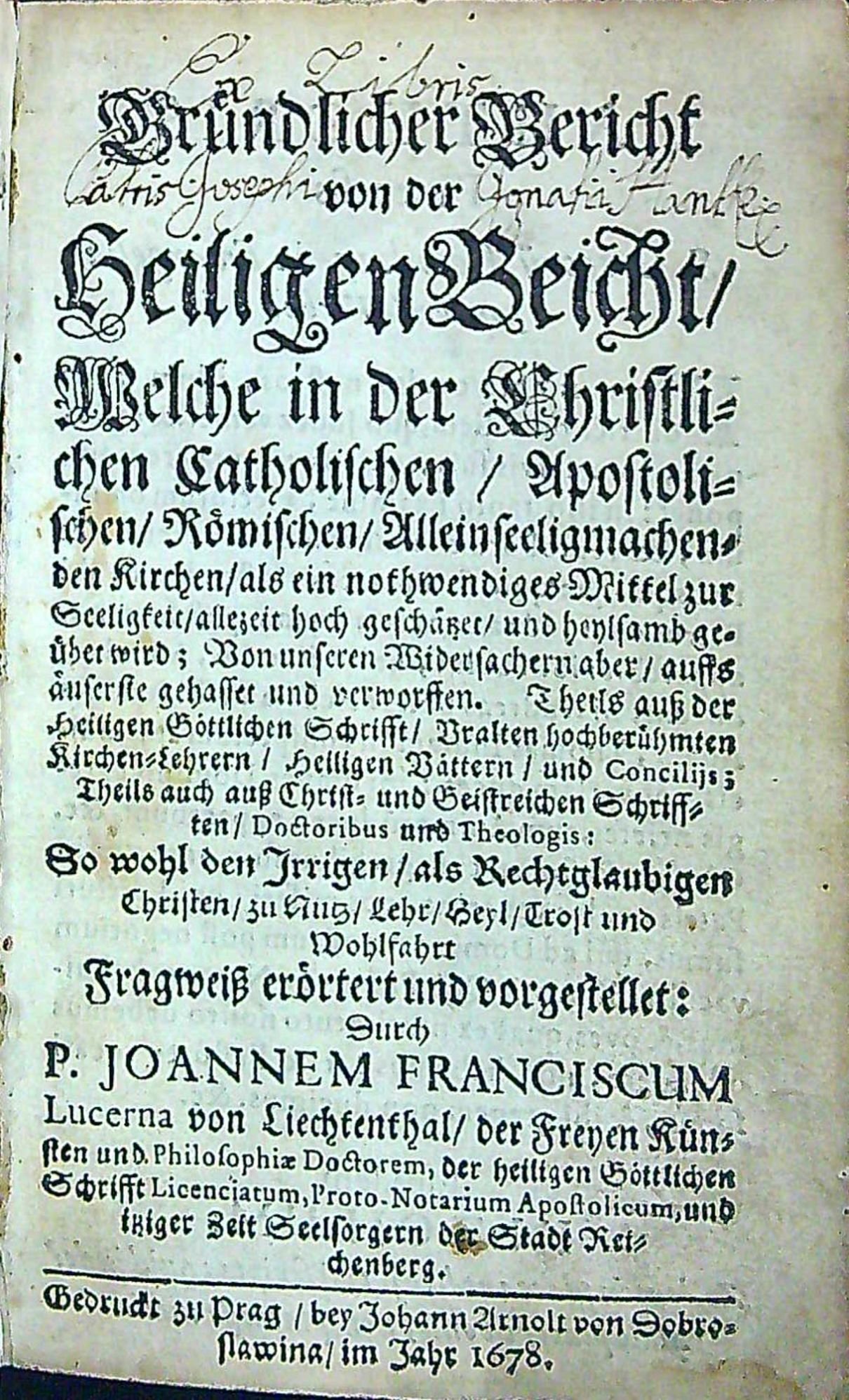 Gründlicher Bericht von der Heiligen Beicht/ Welche in der Christlichen Catholischen/ Apostolischen/ Römischen/ Alleinseeligmachenden Kirchen/ als ein nothwendiges Mittel zur Seeligkeit/ allezeit hoch geschätzer/ und heylsamb geüber wird; Von unseren Widersachern aber/ auffs äuserste gehasset und verworsten. Theils auss der heiligen Göttlichen Schrifft/ Uralten hochberühmten Kirchen=Lehrern/ Heiligen Vättern/ und Concilijs; Theils auch auss Christ= und Geistreichen Schrifften/ Doctoribus und Theologis: So wohl den Irrigen/ als Rechtglaubigen Christen/ zu Nutz/ Lehr/ Heyl/ Trost und Wohlfahrt Fragweiss erörtert und vorgestellet: Durch .....