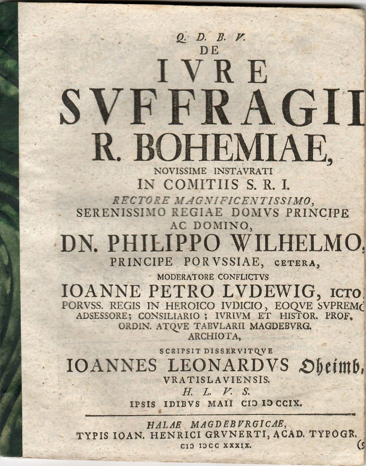Q.D.B.V. DE IVRE SVFFRAGII R. BOHEMIAE, NOVISSIME INSTAVRATI IN COMITIIS S.R.I. RECTORE MAGNIFICENTISSIMO. SERENISSIMO REGIAE DOMVS PRINCIPE AC DOMINO DN. PHILIPPO WILHELMO, PRINCIPE POR VSSIAE, CETERA, MODERATORE CONFLICTVS IOANNE PETRO LVDEWIG, ICTO, PORVSS. REGIS IN HEROICO IUDICO, EOQVE SVPREMO ADSESSORE; CONSILIARIO; IVRIVM ET HISTOR. PROF. ORDIN. ATQVE TABVLARII MAGDEBVRG. ARCHIOTA, SCRIPSIT DISSERVITQVE IOANNES LEONARDVS Oheimb, VRATISLAVIENSIS. H.L.V.S. IPSIS IDIBVS MAII CIC IC CCIX.