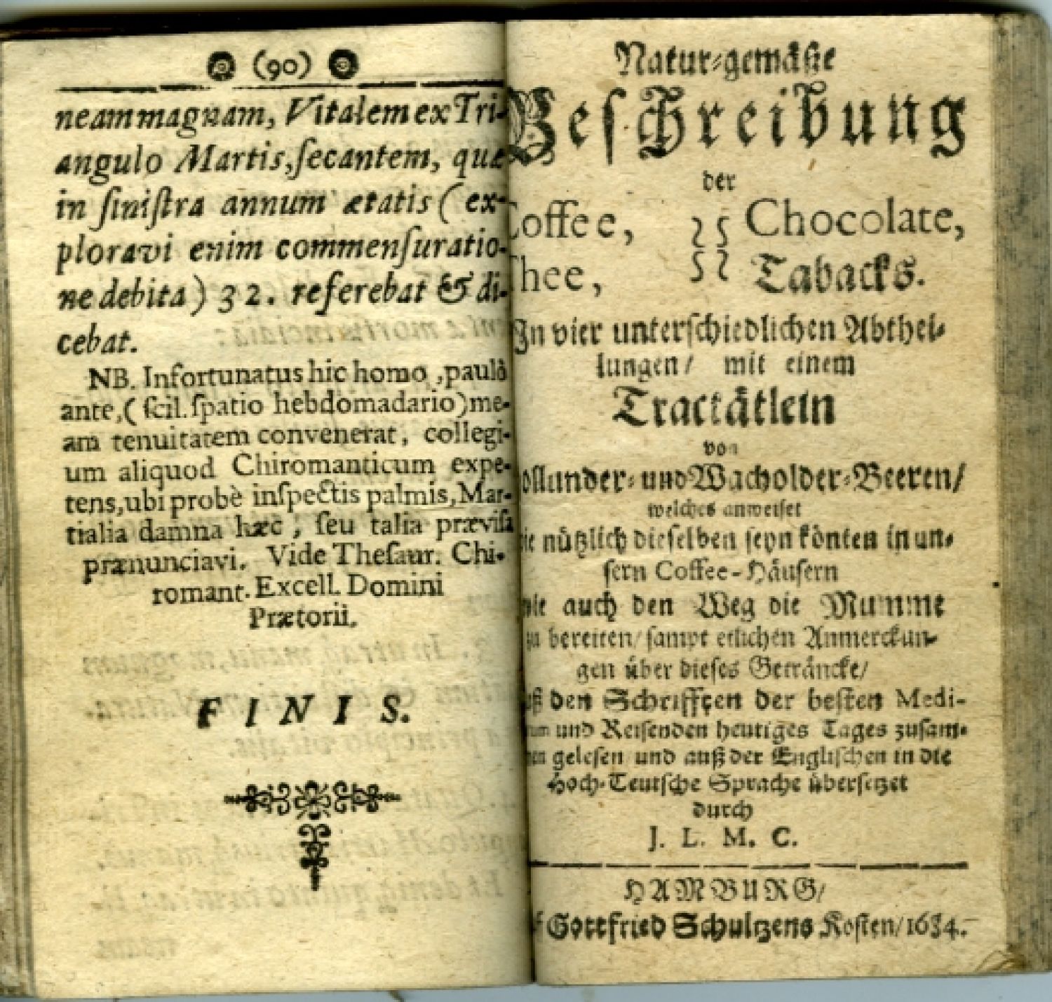 + přívazek: [Lange, Johann:] Natur=gemäße Beschreibung der Coffee, Chocolate, Thee, Tabacks. In vier unterschiedlichen Abtheilungen, mit einem Tractätlein von Hollunder= und Wacholder=Beeren, welches anweiset wie nützlich dieselben seyn könten in unsern Coffee=Häusern wie auch den Weg die Mumme zu bereiten, sampt etlichen Anmerckungen über dieses Geträncke, ... Hamburg, Gottfried Schultze, 1684, 71 str., pásový vlys, viněty rostlinného dekoru, na posledních třech stranách seznam použité literatury.