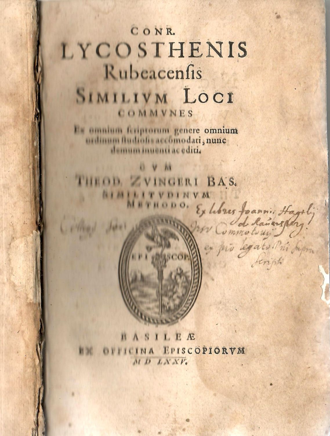 VD 16 W 4316; VD 16 Z 752.<br>Dobová kožená vazba z bílé vepřovice se slepotiskovou výzdobou, přední i zadní deska vazby orámována ornamentálním zrcadlem složeným z kvítků a portrétních medailonků různých církevních reformátorů, uvnitř zrcadla obdélník rozpůlený antickým sloupem, v pravé i levé části s bohatým rostlinným dekorem. Vazba značně odřená, místy potrhaná, s otvory po chybějících tkanicích, naražené rohy, ve hřbetu tři vazy, horní pole hřbetu potrháno, v horní části vyspraven nalepenou koženou páskou, kůže celého hřbetu z ochranných důvodů nabarvena temně zelenou barvou. Na tit. listu starý provenienčí záznam perem. Prvých 364 stran při pravém okraji se stopami po vlhkosti, v textu na několika místech hnědé skvrny. Na posledním listu dřevořezový signet tiskařův.<br>Lederband der Zeit, Blindpressung teils verwischt. Rücken mit zwei kleineren Fehlstellen, im Oberrand etwas unfachmännisch repariert, Ecken bestossen und oben ausgefranst, leicht wurmspurig. Bindebänder fehlen. Vordere Vorsätze erneuert.<br>Textteil in der ersten Hälfte wasserfleckig, ab S. 353 winzige runde Löcher, am Anfang und gegen Ende grössere Wurmspuren. Altes hs. Exlibris auf dem Titel, kleinere Fehlstelle im Rand unterlegt. Sporadische Vermerke und Durchstreichungen mit Tinte im Text. Holzschnitt-Druckermarke auf dem Titel und am Schluss.<br>Vorliegende "Ähnlichkeiten der Hauptgegenständen" verfasste luth. Theologe, Humanist und Schriftsteller Conrad Wolffhart, der später den griechischen Namen Lycostenes annahm. Das Buch ist in Latein geschrieben, vereinzelt auch griechische Schrift.<br>Conrad Lycostenes, 1518 im Elsass geboren, studierte in Heidelberg und war seit 1542 Professor für Grammatik und Dialektik in Basel, wo er 1561 starb. Er gehört in die Reihe der bedeutenden polyhistorisch Gelehrten des 16. Jahrhundert.<br>Der schweizer Philologe und bekannter Mediziner Theodor Zwinger der Ältere (1533 - 1588) gab nach dem Tod seines Stiefvaters Conrad Lycosthenes einige von seinen Schriften, u. a. auch das Theatrum Vitae Humanae = Schauplatz des menschlichen Leben, heraus. Diese Universalenzyklöpedie in Latein erscheinen erstmals 1565, die folgenden Auflagen von 1571, 1586 und 1604 wurden jeweils erweitert. Zwingers Werk Similitudinum methodus, das sich bei Lycosthenis Loci communibus befindet, wurde nochmals 1595 und 1602 herausgegeben.