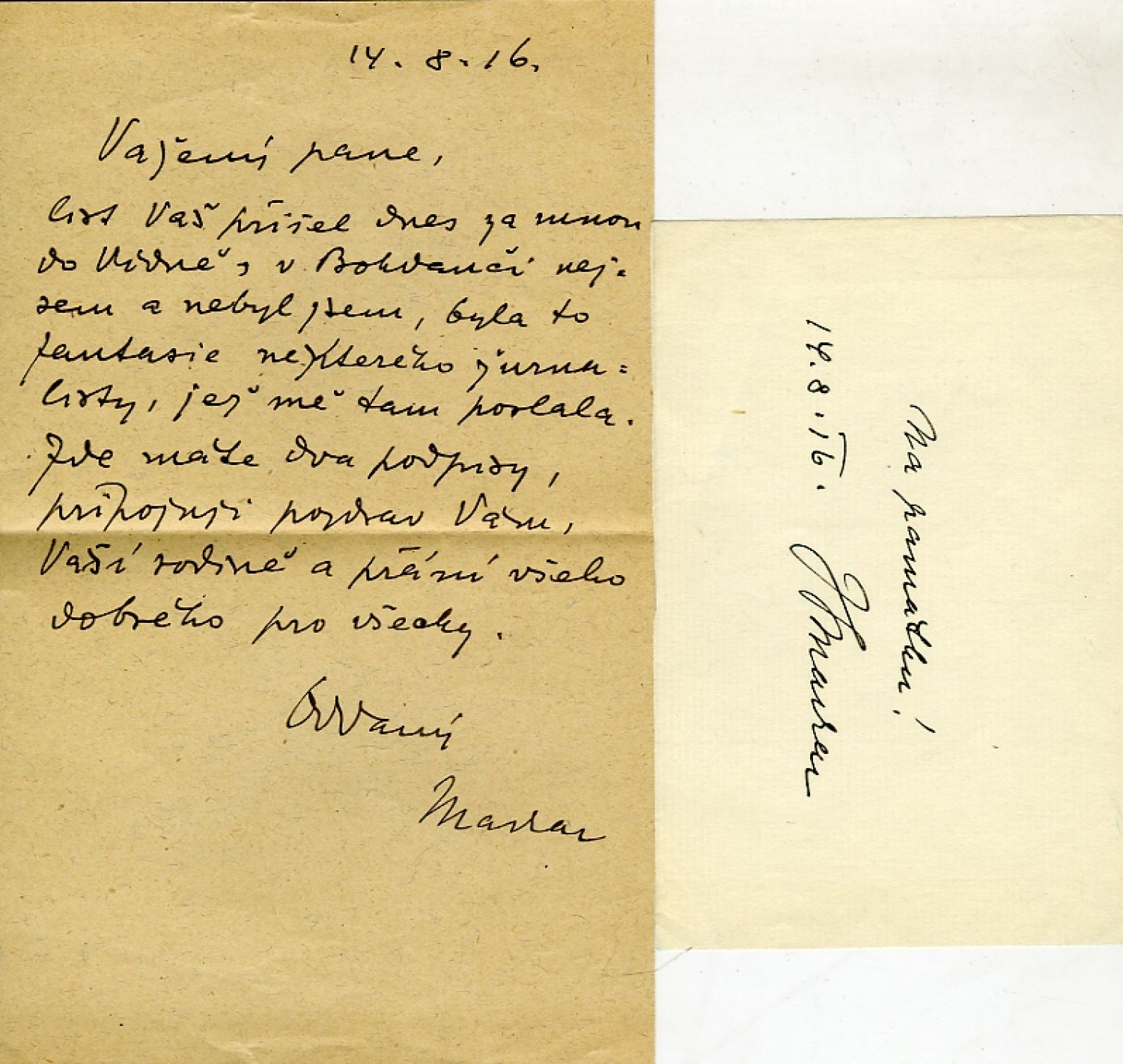 V půli přeložený list 200 x 124 mm popsaný po jedné straně černým inkoustem. Dopis Jos. Nesvadbovi, učiteli v Soběslavicích, datovaný 14.8.16; oznámení, že list adresátův přišel za Macharem do Vídně, jenž v Bohdanči není a nebyl, zdraví a připojuje dva podpisy: tyto na dvou ústřižcích papíru s vodoznakem 90 x 137 mm, nesoucí přípis "Na památku!" a téže datum, jako dopis. Vše v ofrankované obálce.<br>
