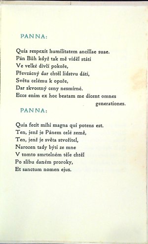 Ex. č. 1 ze 75 číslovaných (celkový náklad byl 350 výtisků), které písmem Cicero Ver Sacrum vytiskl Karel Kryl v Kroměříži. Francouzsko-český tisk (na levé straně francouzský originál, vpravo český překlad), versálkami modře tištěné nadpisy. Přeložil O. F. Babler. Za tit. listem na líci prvé strany textu notový tisk s textem. - Původní pap. obálka, ve které je volně vložený složený tiskový blok.