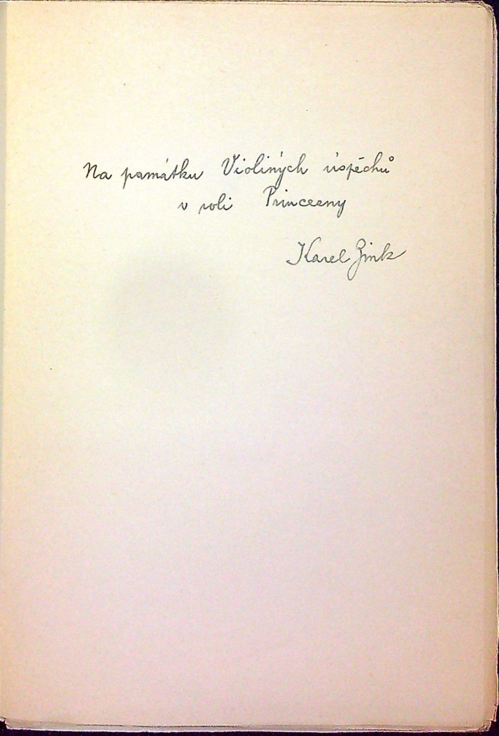 Jeden ze 300 vydaných výtisků, které typy písma Clauda Garamonda vytiskla knihtiskárna F. Obziny ve Vyškově, upravil Ed. Milén. Na předním vakátu rkp. dedikace perem "Na památku Violiných úspěchů v roli Princezny Karel Zink". - Obálka lehce zašpiněná a při horním okraji hřbetu mírně natržená.