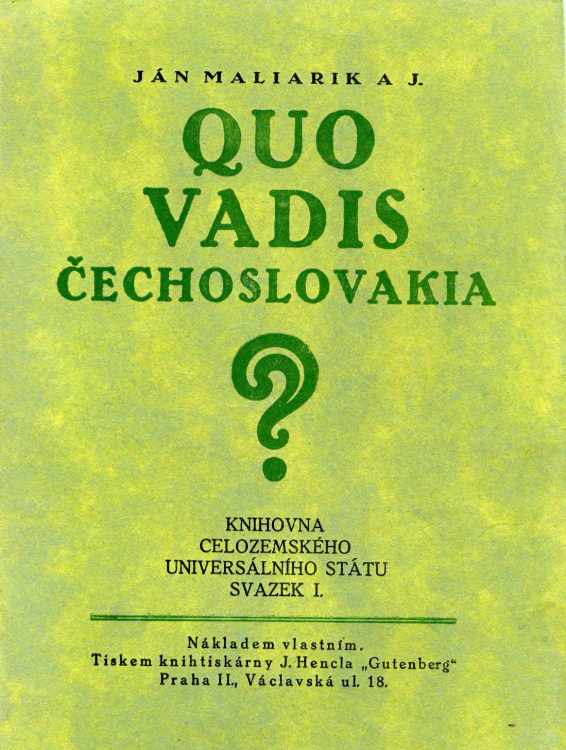 Knihovna celozemského universálního státu, sv. I. S úvodním slovem Heřmana Doležala a studií Jos. B. Nežáreckého, dle kterého farář Maliarik, zavřený c. k. úřady r. 1916 do pražského blázince na Karlově pro přednesení mírové řeči v hledišti Národního divadla, "jest duchovně výše, než ... Rabindranáth Thákur, poněvadž je moderním filosofem slovanským a má otevřené oči pro bídu celého světa", o čemž svědčí namátkou tento axiom: "Poněvadž rozkoš jest slepá, zlá a ukrutná, není možné jí přikázání jinak vydat než přísné hromovým hlasem: Zdolat rozkoš!! Zdolat rozkoš!" - Velmi dobrý stav.