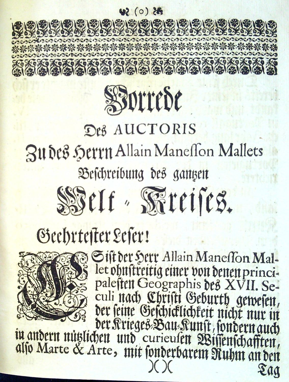 <br>A. Manesson-Mallet (1630-1706), franc. kartograf a inženýr, sloužil nejprve v portugalské, poté ve francouzské armádě Ludvíka XIV. Jeho pětisvazkové dílo "Description de l'Univers", obsahující geografické a astronomické vědění oné doby, vyšlo r. 1683 v Paříži a hned následujícího roku bylo přeloženo do němčiny. Ilustrace tohoto 2. německého vydání jsou převzaty z německého prvého. – V I. dílu chybí tab. 16 a portrét Ludvíka XIV., jemuž autor toto monumentální dílo připsal.