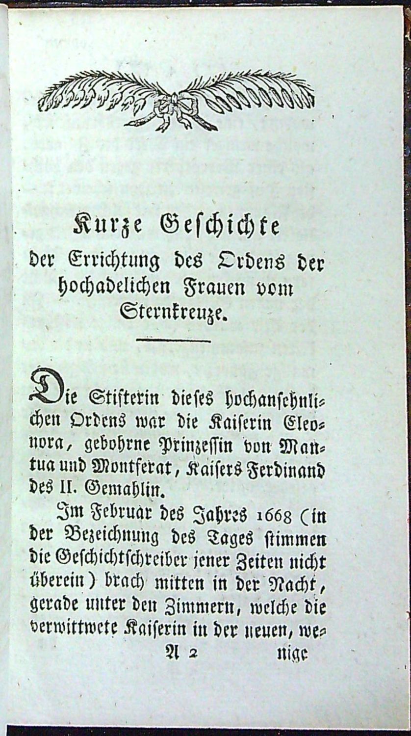 Tištěno švabachem, tučně tištěné versálky, arabská paginace stran uprostřed horní strany mezi drobnými tiskařskými ozdůbkami. <br>Kartonové desky potažené plátnem (z konce 19. století), dobový kožený hřbet zdobený tlačeným a zlaceným rostlinným ornamentem, v horní třetiny dobový kožený štítek s tlačeným názvem, červeně barvené ořízky, na předsádkách a přídeštích dobový olejový papír, na předním přídeští nalepeno ex libris "Fürst Clary´sche Bibliothek Teplitz" a na předním vakátu staré, zčásti nečitelné razítko "Knihovna města ?" a ev. čísla tužkou.<br>Eleonora Magdalena Gonzagová (18.11. 1630 Mantova - 16.12. 1686 Vídeň) rodem mantovská princezna, třetí manželka římského císaře a krále uherského, českého ... Ferdinanda III. Ve Vídni mimo jiné založila roku 1657 italskou liter. akademii a roku 1656 byla v Praze korunována svatováclavskou korunou. Dámský Řád hvězdového kříže (o kterém kniha pojednává), který existuje dodnes založila roku 1668.