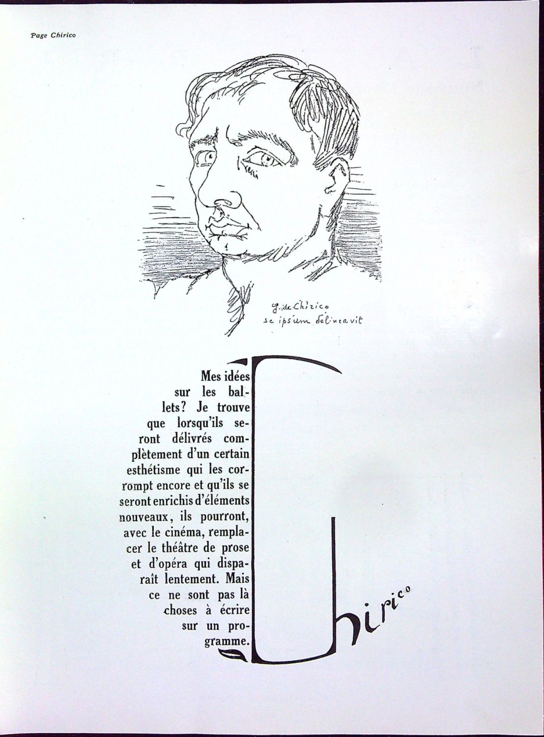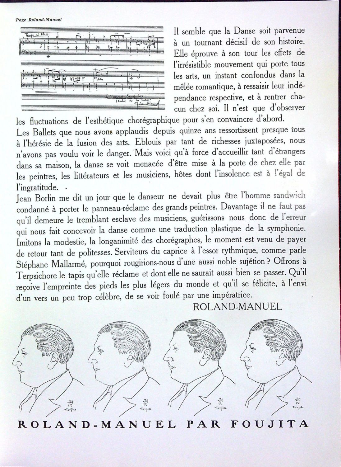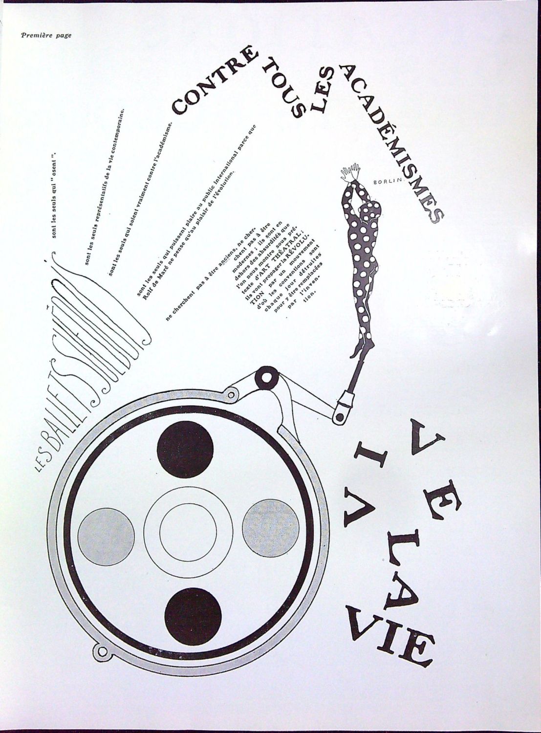 V textu ilustrace od Francise Picabii, G. de Chirica, Foujity, B. Grigorina s portéty různých skladatelů, tanečníků, scénických návrhů a několik fotograf. portrétů. Doprovodné texty jsou v různých typografických kompozicích. Na přední straně obálky barevná kompozice od Marie Vassilieff, na straně zadní od F. Legera. <br>Rolf de Maré (9.5. 1888 Stockholm - 28.4. 1964 Barcelona) švédský sběratel umění, v letech 1920-1925 vedoucí pařížského baletního souboru "Ballets Suédois" jehož choreografem a prvním tanečníkem byl Jean Börlin, který se stal Marovým milencem. Roku 1931 po Börlinově smrti založil na jeho památku v Paříži první výzkumné centrum a muzeum tance na světě, které se stalo důležitým centrem pro studium tance.