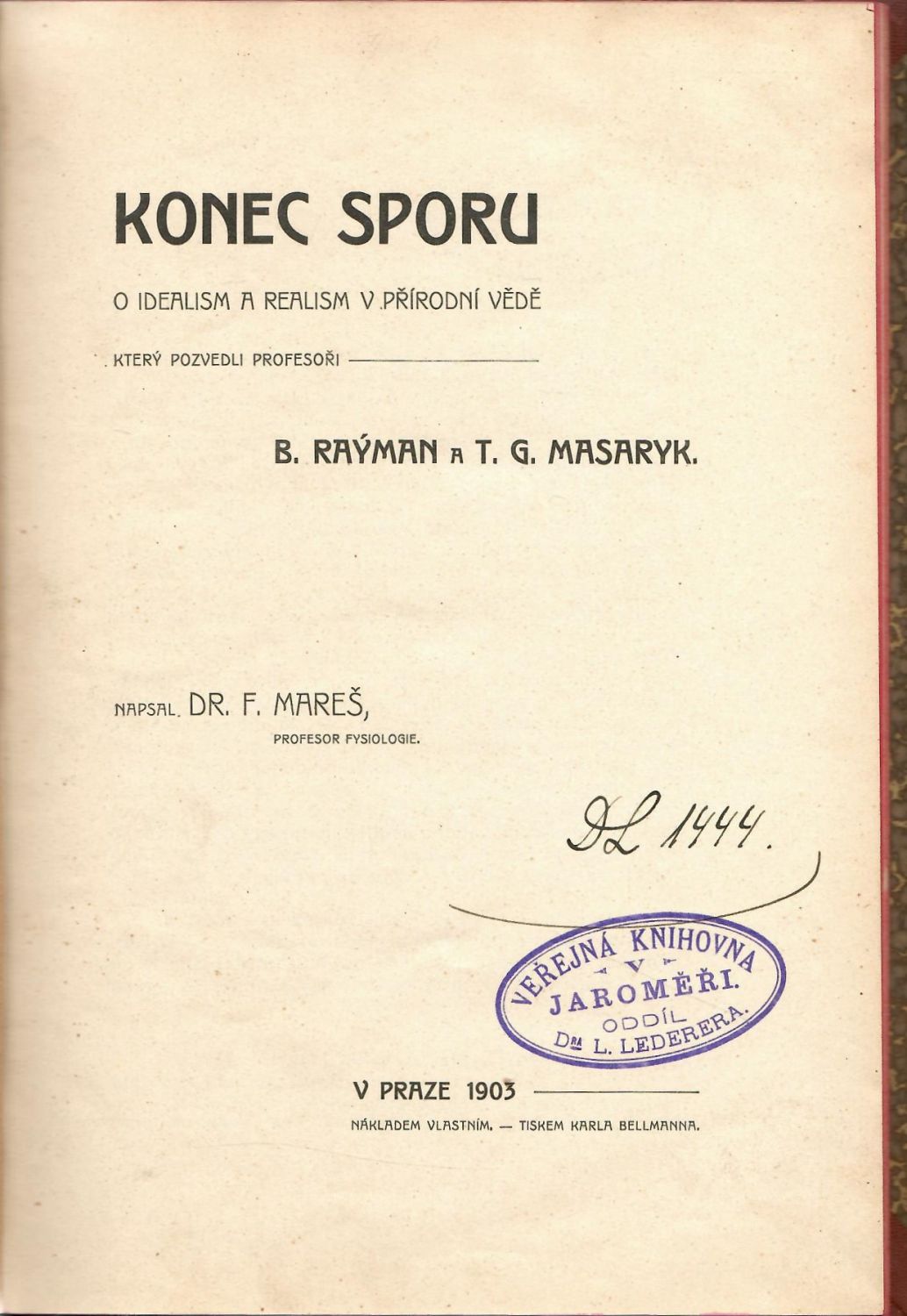 Konec sporu o idealism a realism v přírodní vědě který pozvedli profesoři B. Raýman a T. G. Masaryk.