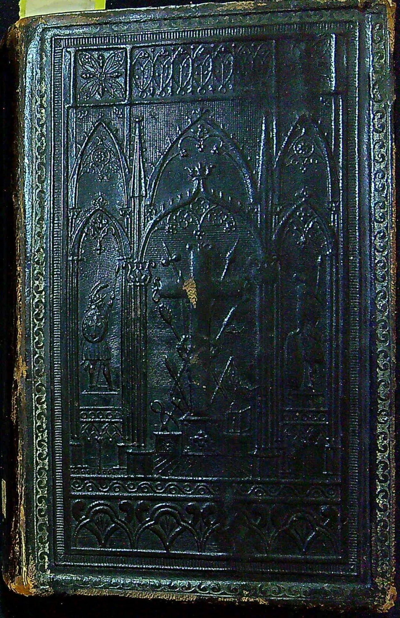 Dobová vazba z černé hověziny, desky zdobené tlačeným rámem, uvnitř rámu trojlodní kaple s křížem uprostřed a po stranách stojícími dvěma muži ve zbroji, hřbet dělený třemi ozdobnými pásy do 4 polí, na přídeštích a předsádkách dobový olejový papír. Dva listy při horním vnějším okraji lehce ohnuté, jinak ve stavu dobrém.