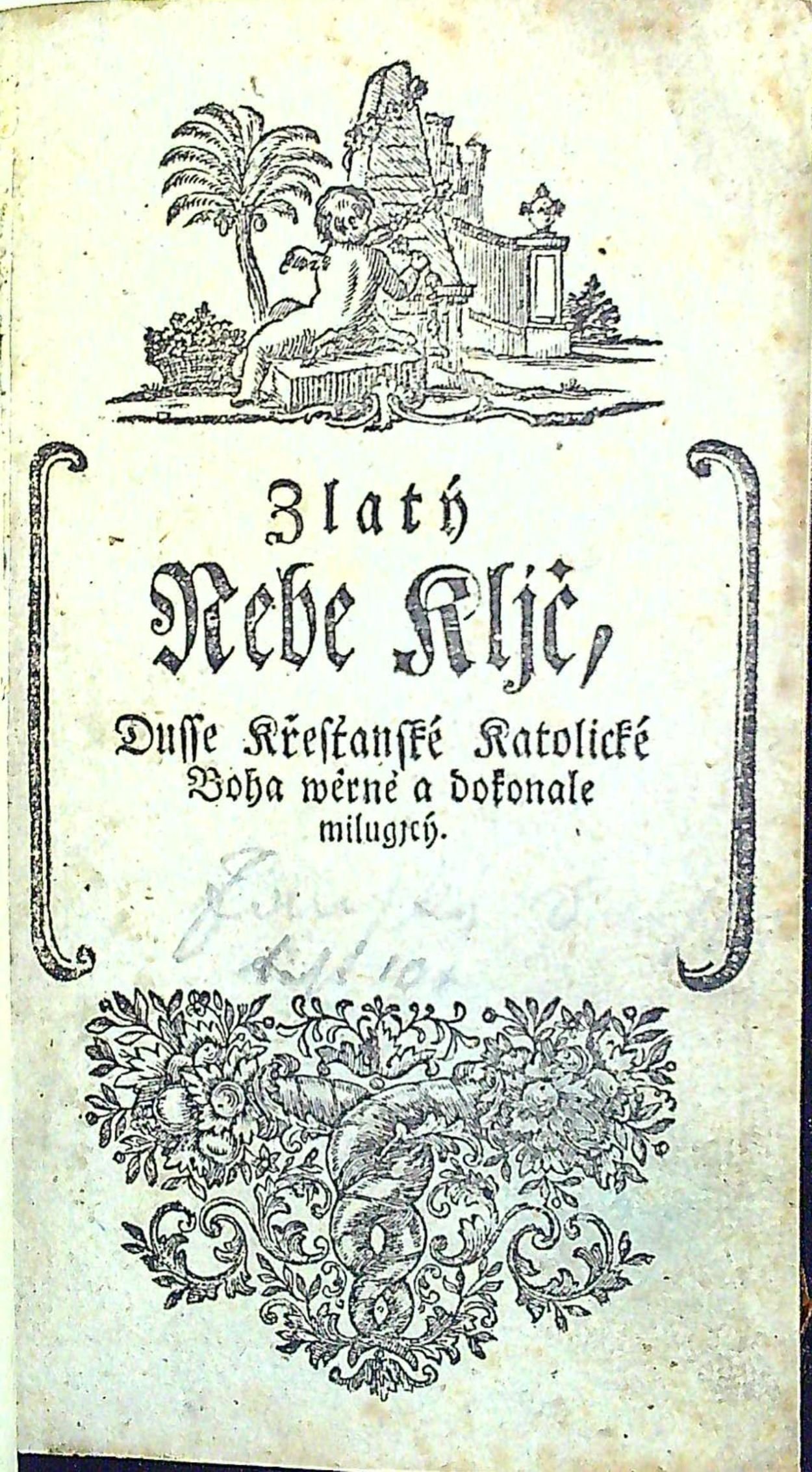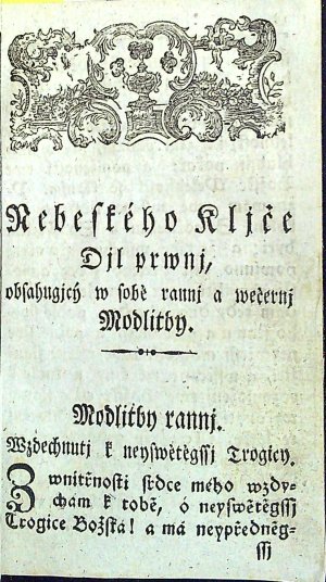 Zlatý Nebe Kljč, Dusse Křesťanské Boha wěrně a dokonale milugjcý. To gest wraucné katolické Modlitby, na dwanáct djlů rozwržené, rannj, wečernj, při mssi swaté, k swaté zpowědi a přgjmánj, gakož y k neyswětěgssj Trogicy, a Swátosti oltářnj, ......... Pro pobožné pohlawj ženské.