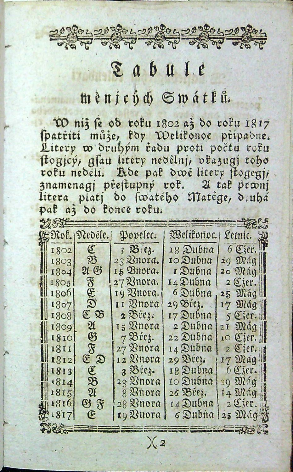Tištěno švabachem, latinská slova antikvou, červeno-černě tištěný tit. list v ozdobném prolamovaném rámečku, impresum pod ozdobnou linkou, tabule měnících se svátků od roku 1802 do roku 1817, ozdobné lišty a linky, živá záhlaví, tučně tištěné iniciály ve výši 2 řádků, viněty, z záhlaví prvního dílu pásový vlys rostlinného dekoru.<br>Dobová vazba z temně hnědé hověziny, na obou deskách tlačený a zlacený rám z rostlinného ornamentu, uprostřed rámu tlačená a zlacená květina, ve hřbetu zlacenými tyčemi vymezeno 6 polí, v jednotlivých polích tlačená a zlacená květina. Vazba ohmataná a místy odřená (květina na zadní desce zčásti utržená, naražené rohy, zlacení vybledlé, desky podél hřbetu zčásti naprasklé, rytina mezi str. 416-417 z knižního bloku odpadlá, místy drobné stopy od červotoče.