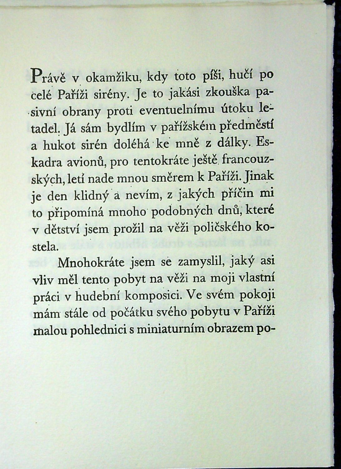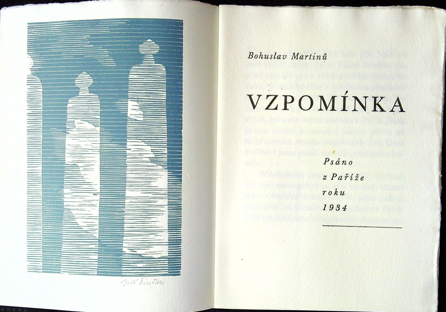 Jeden z 200 vydaných a nečíslovaných výtisků, které k 15. výročí úmrtí Bohuslava Martinů jako svůj soukromý tisk vydal František Popelka v Poličce. Obálku navrhl Jiří Šindler, na ruční papír vytiskly Východočeské tiskárny, n. p. Pardubice, provoz Svitavy. - Původní graficky řešená obálka s chlopní, ve které jsou volně vložené složené tiskové archy.