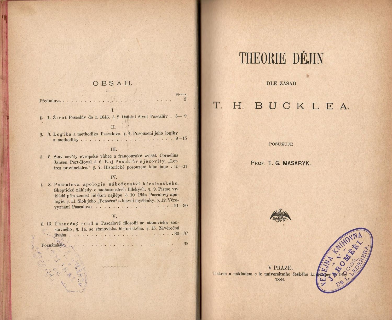 Blaise Pascal, jeho život a filosofie. Theorie dějiny dle zásad T. H. Bucklea. Počet pravděpodobností a Humova skepse. O hypnotismu (magnetismu zvířecím).