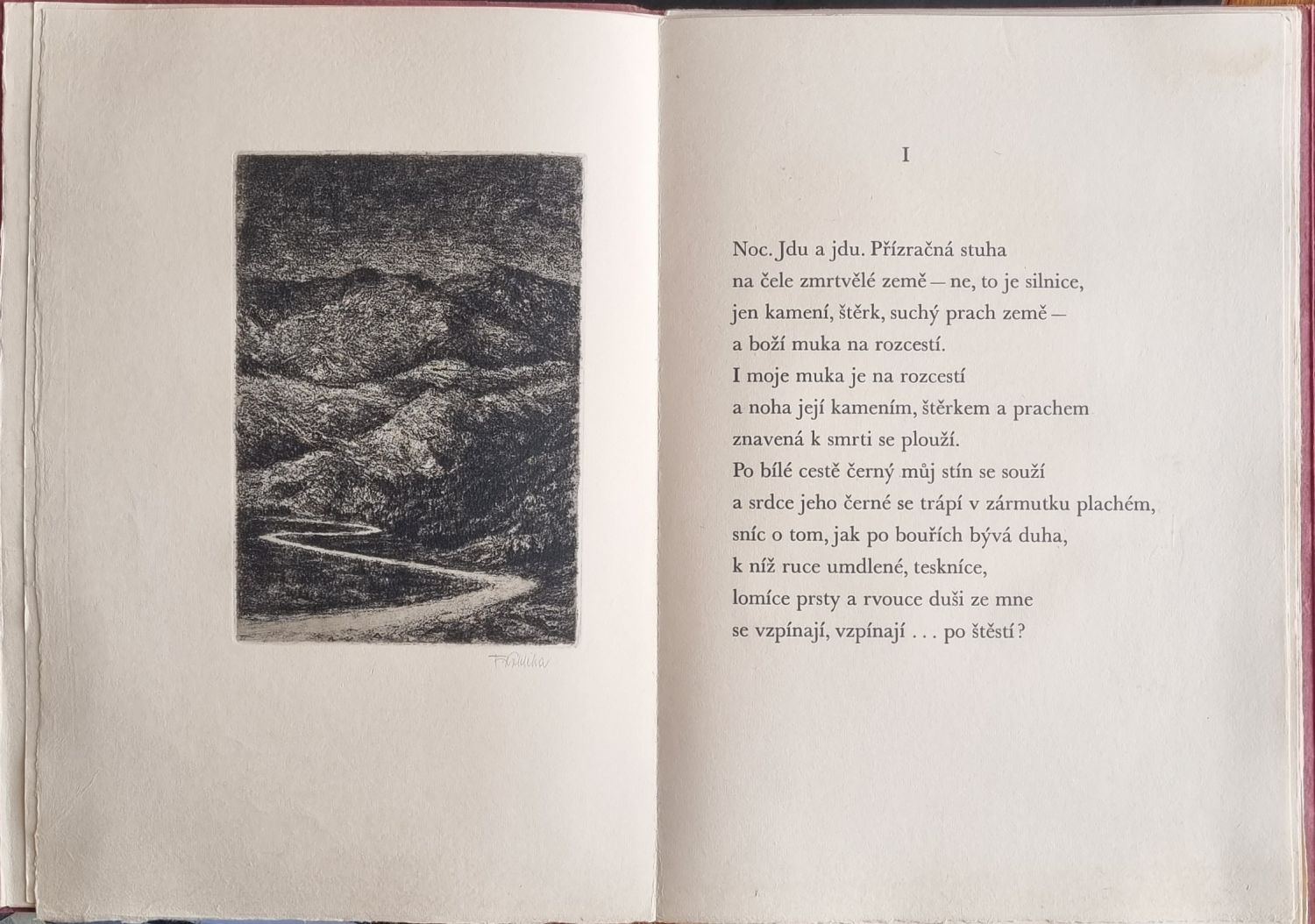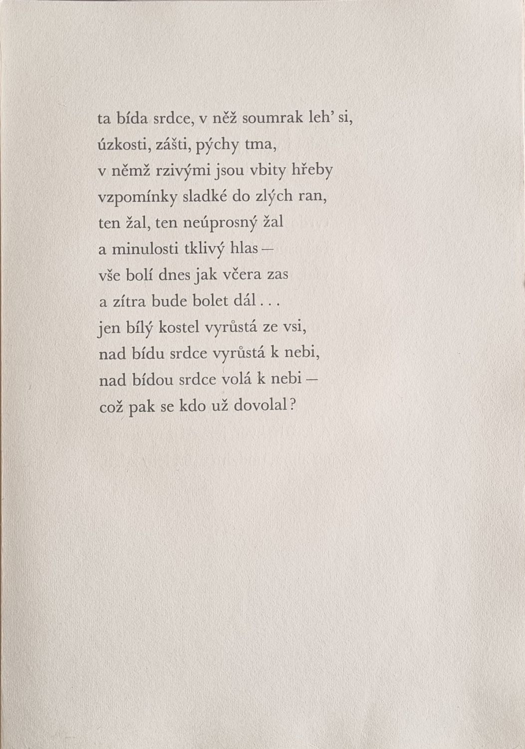 | Ilustrace: | Typograficky upravil a dvěma pův. dřevoryty (na předním palistu a dvoubarevným na tit. listu) a osmi původními, celostránkovými, autorem podepsanými vernis-mou vyzdobil František Kobliha. |