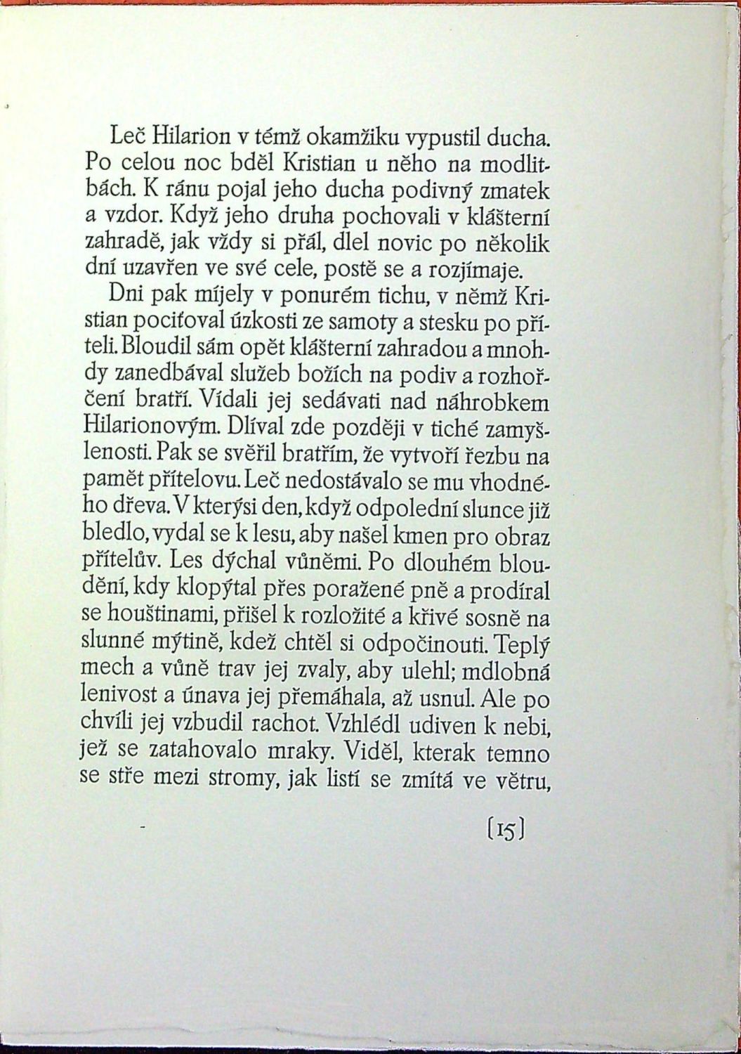 Ex. č. 17 z 25 výtisků tištěných střední Malostranskou antikvou na pravý japan, vytiskla Státní tiskárna v Praze za vedení Karla Dyrynka. Červeně tištěné vinětky a vstupní iniciála s počátkem textu tištěného červeně versálkami. <br>Původní kartonová vazba potažená červeně barveným škrobovým papírem s chlopněmi (původní adjustace), původní kartonové ochranně pouzdro. Na patitulu podpis Medkův černým perem. Volně vložen fotograficky portrét Medkův od architekta Jana Vaňka s Medkovým podpisem.