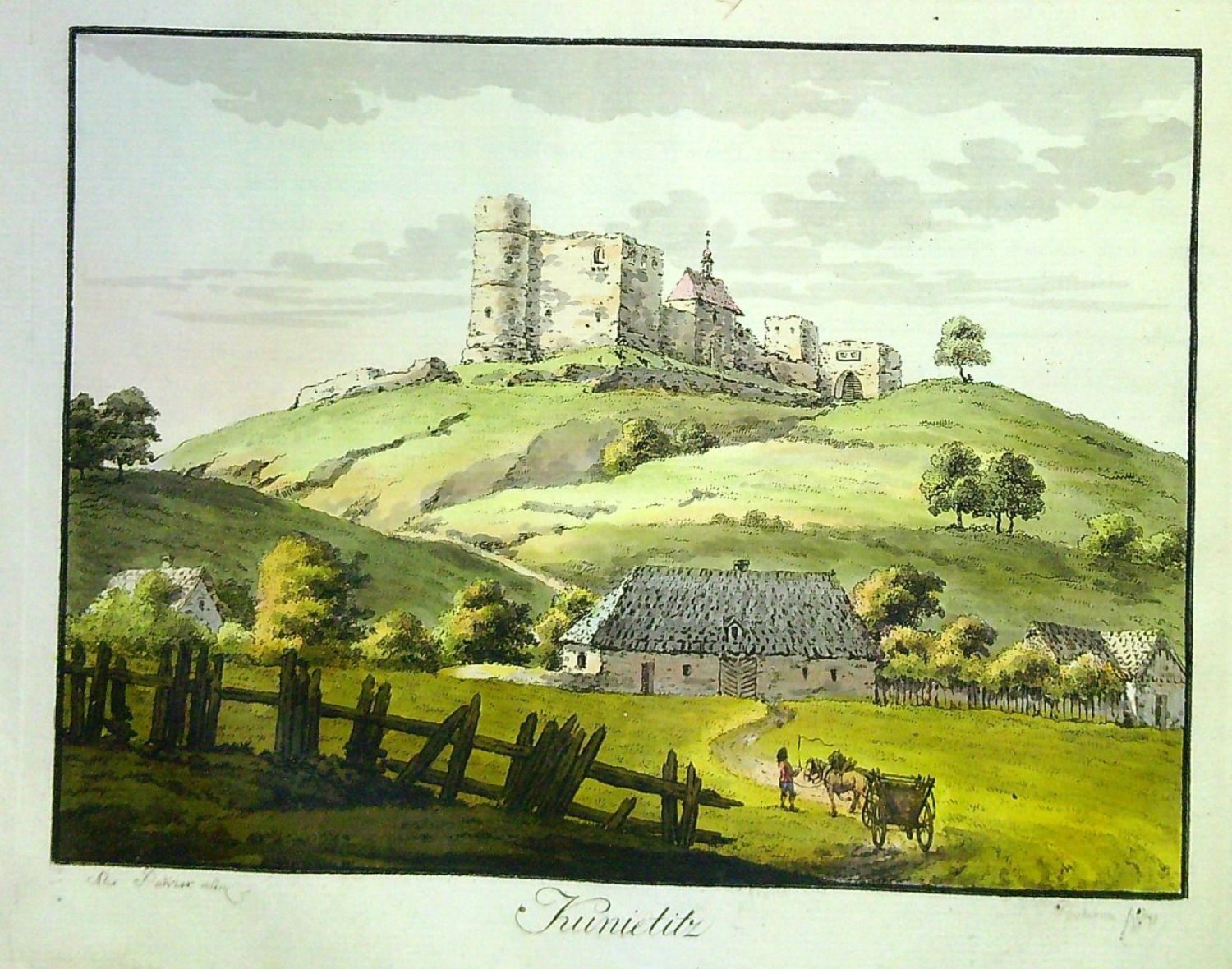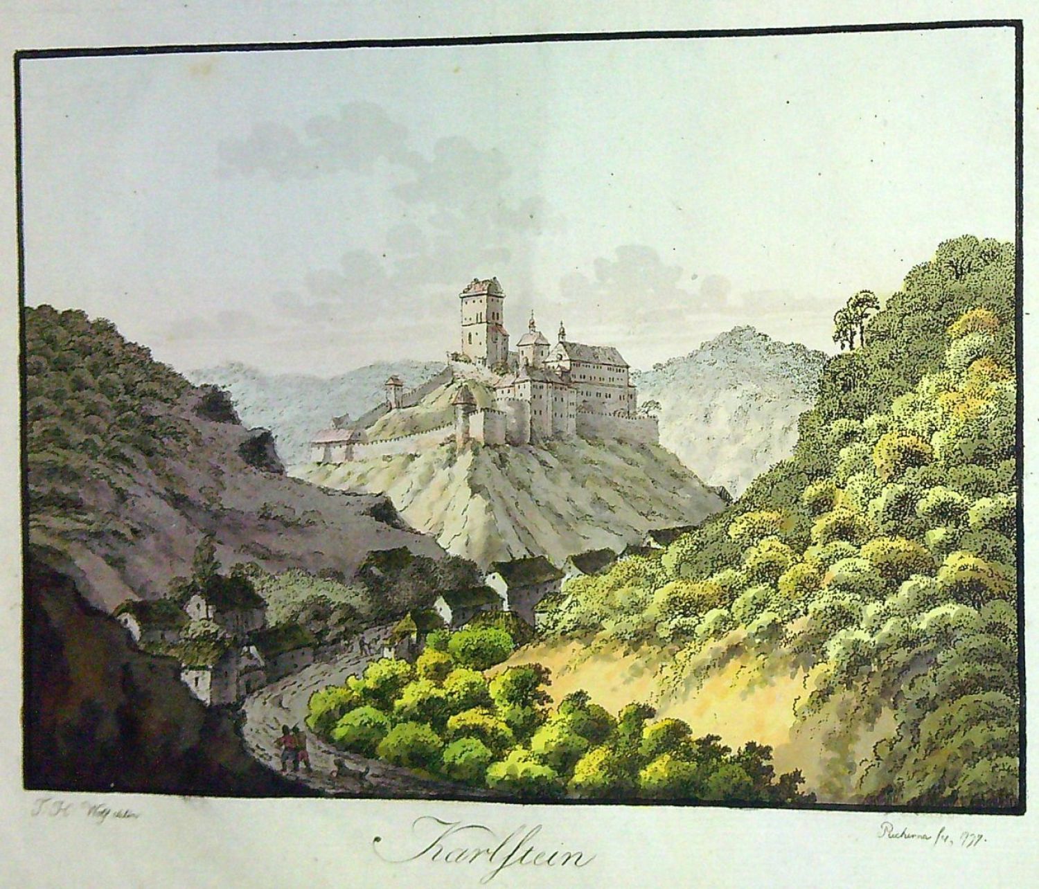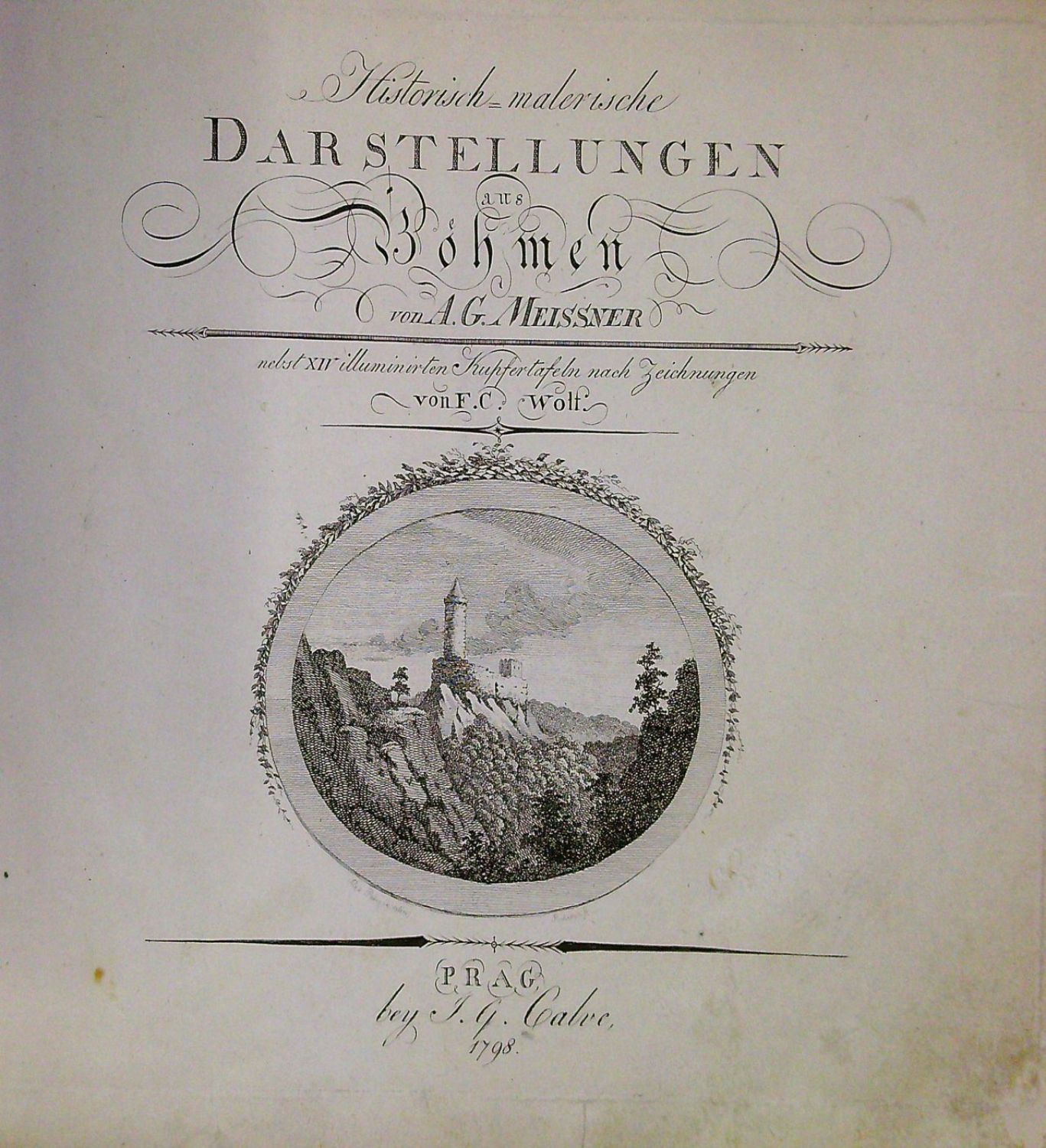 | Ilustrace: | Na rytém tit. listě viněta s hradem Kokořín, koncová rytá viněta s hradem Jestřebí, v textu 14 ručně kolorovaných mědirytinových, v desce signovaných příloh s vedutami českých hradů a zámků, které podle kreseb F. C. Wolfa ryl a koloroval Antonín Pucherna: Karlštejn, plán Karlštejna, Krakovec, Jenštejn, Křivoklát, Kunětická Hora, Rábí, Rychmburk, Český Štenberk, Frýdlant, Červený Hrádek u Jirkova, Rychnov nad Kněžnou, Trosky a Jestřebí. |