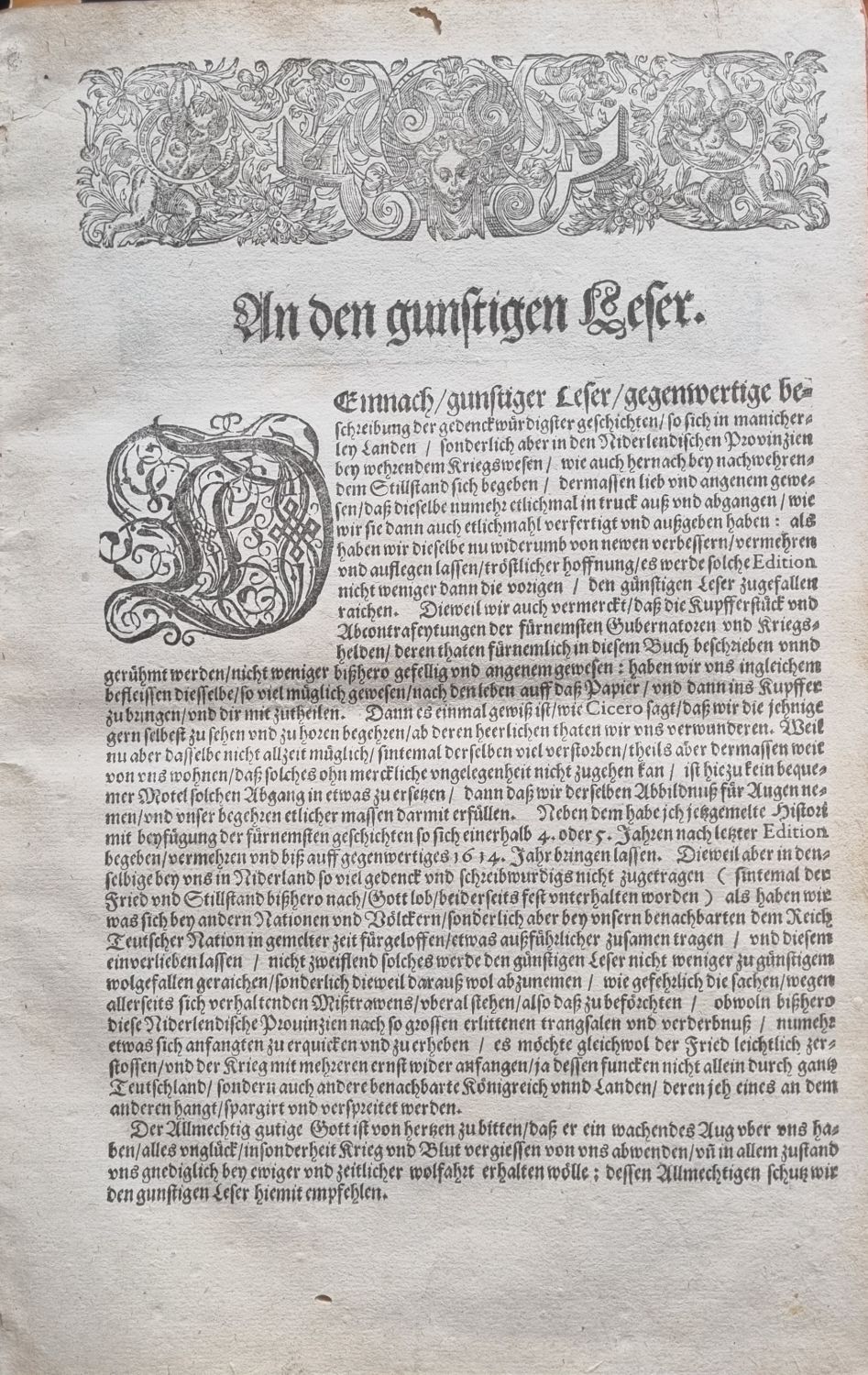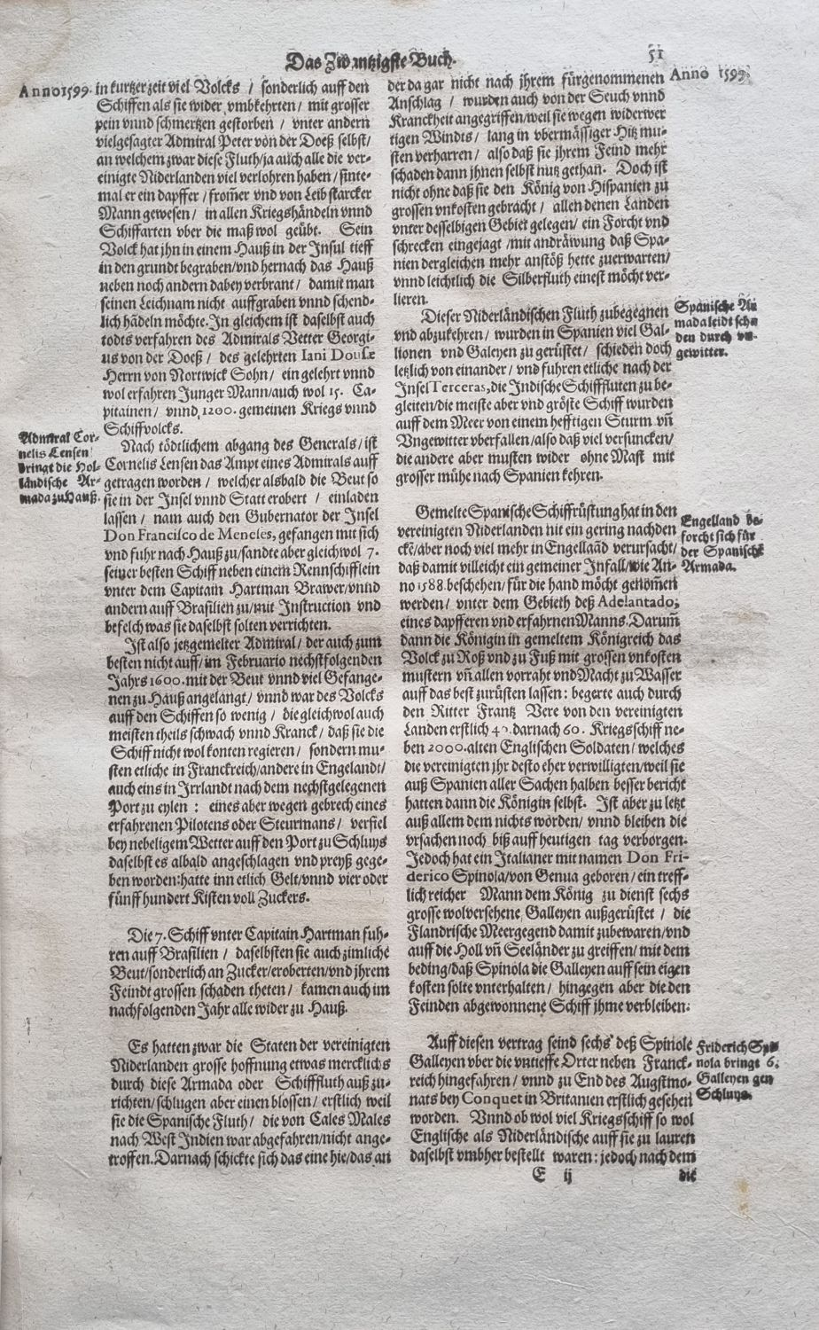 Tištěno švabachem, pod rytinami rytý text antikvou. Tisk ve dvou sloupcích, živá záhlaví, plné iniciály propletené rostlinným dekorem zalomené do výše 5-12 řádků, plné iniciály propletené úponky ve výši 3 řádků, konturová iniciály na ilustr. pozadí zalomená do výše 6 řádků, vstupní pásový vlys, koncová viněta. Od strany 700 chybná paginace.<br>Dobová pergamenová vazba, ve hřbetu 5 vazů, v prvním a druhém poli černým inkoustem název a vlastnický záznam "Dominici Custodis", v poli spodním starý pap. štítek s číslem, červeně barvené ořízky. Vazba ohmataná a zašpiněná, papír zahnědlý, okraje (bez zásahu do rytin) dvoustranné přílohy neoříznuté (nepravidelně utržené), na některých listech při okrajích cestičky od červotoče. Hřbet a zadní deska vazby od knižního bloku odlepené.<br>Emanuel van Meteren (1535 Antverpy - 1612 Londýn) vlámský historik a konzul zastupující holandské obchodníky v Londýně, kde žil v emigraci z náboženských důvodů, vyznáním byl protestant.