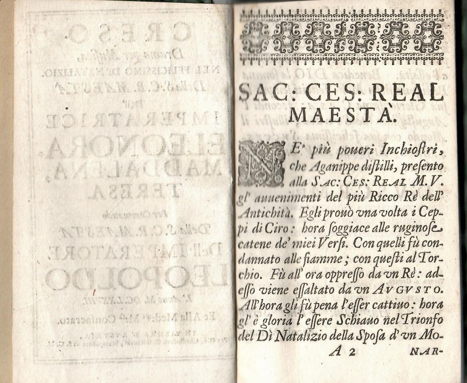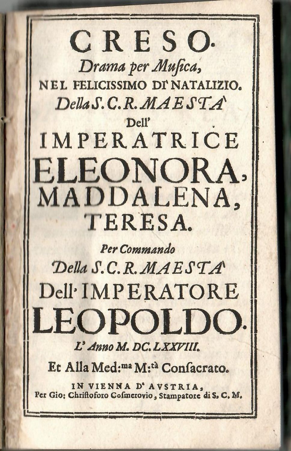 CRESO. Drama per Musica, NEL FELICISSIMO DI´NATALIZIO. Della S.C.R. MAESTA Dell´ IMPERATRICE ELEONORA, MADDALENA, TERESA. Per Commando Della S.C.R. MAESTA Dell´ IMPERATORE LEOPOLDO.