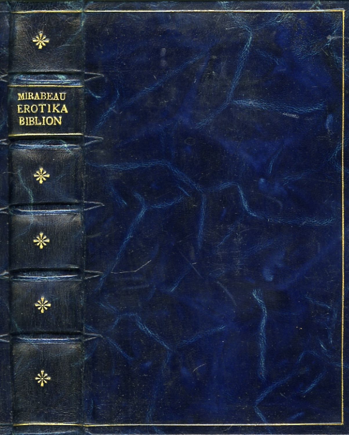 Hayn-Got. IV, 549-550<br>Ex. č. 64 z 500 vydaných a tištěných na holandském pap. van Gelder. Dvoubarevně tištěný tit. list. - Dobová vazba z temně modrého marokénu, ve hřbetu 5 vazů, ve druhém poli tlačený a zlacený název, v ostatních polích tlačená a zlacená sluníčka, barvená svrchní ořízka.<br> Honoré Gabriel hrabě de Mirabeau (17.3.1749 - 2.4.1791 Paříž), vynikající řečník a politik, jedena z nejvýznamnějších postav Velké francouzské revoluce, zasazoval se o konstituční ústavu a odmítal zbytečné násilí. Naštěstí pro něj zemřel dříve než se revoluce proměnila v krvavá jatka, po jeho smrti ho jakobíni prohlásili za zrádce revoluce a nechali jeho ostatky odstranit z Pantheonu. "Erotika Biblion", vyšla poprvé anonymně roku 1775 V Neuchatelu ve Švýcarsku. Toto vydání je opatřeno bibliografií předchozích vydání z pera Chevaliera de Katrixe a předmluvou. Za autorovým komentářem ke knize, následuje 10 kapitol s autorovými úvahami o onanismu, homosexualitě, lesbické lásce, sodomii, obřízce, různých formách prostituce apod., doprovázené autorovými filosofickými reflexemi.