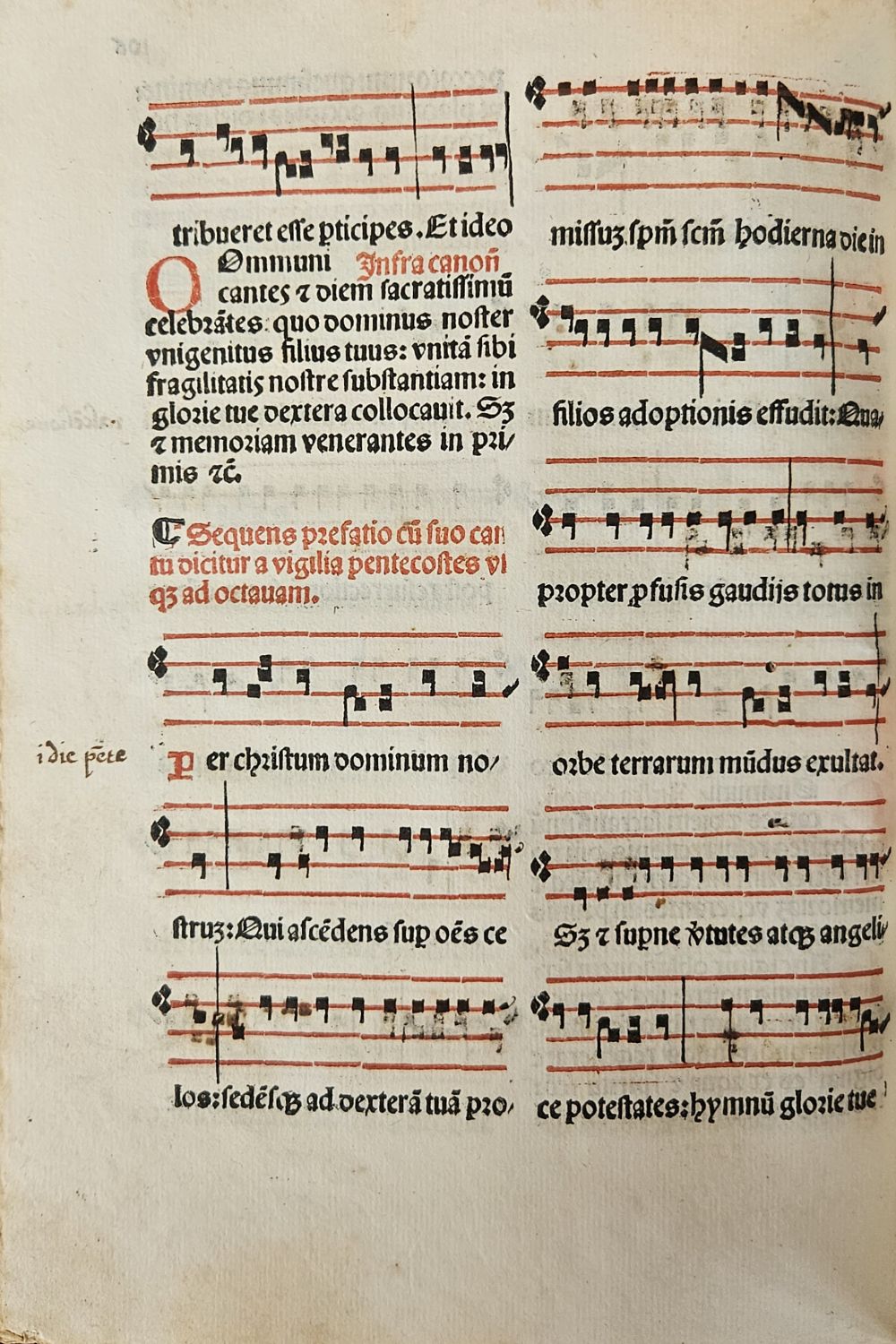 Tisk rotundou, dvoubarevný tisk (červeno-černý), tištěno ve dvou sloupcích, tabule svátků ve třech, živá záhlaví, paginace listů při vnějším horním okraji. Červeně tištěné versálky ve výši 2 řádků, řada konturových iniciál na ilustrativním pozadí ve výši 4-7 řádků. Na titulním listu dřevořez ve dvojitém jednoduchém rámečku (70 x 85 mm) a červeně tištěný signet tiskařův. Čtyř řádková notace. Chyby v paginaci (místo folia 41 natištěno 37, 43 (37), 176 (179), 224 (24), 226 nenatištěno). Impresum v kolofonu "Jossuq[ue] [et] impe[n]sis nobilis viri Lucantonij de Giunta florentini: Leonardo Lauretano serenissimo venetia[rom] principe imperante: Anno a nat[iuitate] d[omi]ni M.CCCC. IX, XJ. cale[n]das februarij in alma venetiarum vrbe mpressus ...." (11. 2. 1509) <br>Pozdně renesanční vazba, dřevěné desky potažené hovězinou, na obou deskách dvojitý rám zdobený slepotiskem, ve hřbetu 5 vazů, na přední desky dvě torsa kožených přezek, na desce zadní dva plechové úchyty. Na přídeštích a předsádkách mramorovaný papír z 20. století, na vakátech papír z 20. století. Vazba místy odřená. Titulní list zahnědlý a při spodním vnitřním okraji mírně pomačkaný, po folio 90 v textu drobné dírky od červotoče, folio 197 při spodním okraji nepravidelně oříznuté, folio 249 při horním vnějším okraji natržené, od folia 249 při spodním vnějším okraji světle hnědé mapy od vlhkosti, folio 263 při vnitřním okraji lehce natržené a vyspravené. V textu řada marginálií černým perem v latinském jazyce z 18. či 19. století, za textem přivázáno 11 listů černým a červeným perem kaligrafického rukopisu v latinském jazyku doplňujícím tištěný text, rukopis místy zčernalý a papír na několika místech proděravělý následkem putování červotoče.
