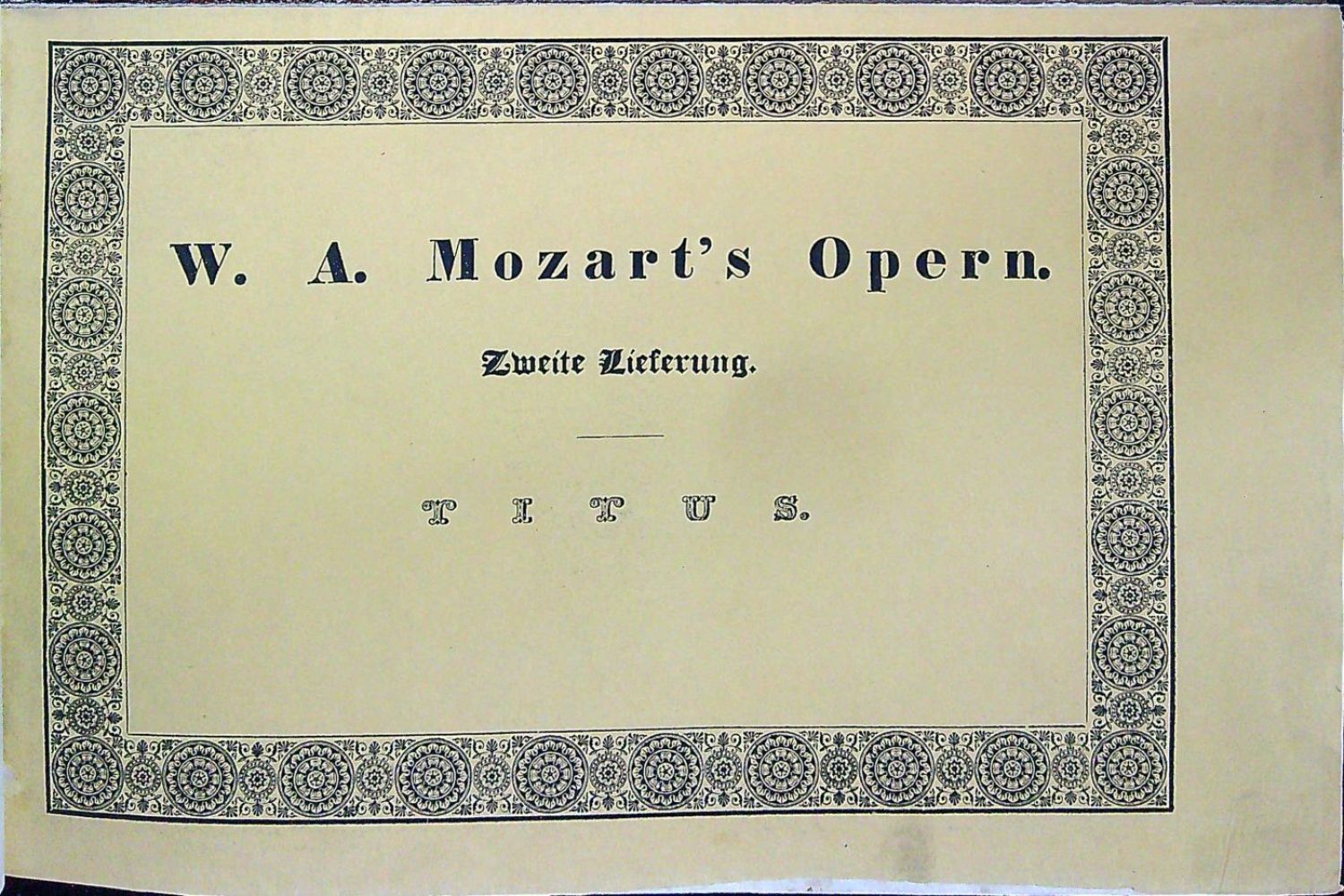 RISM A,I,13M 5116a; Hirsch IV,1223.<br>Podlouhlý kvart (172x262 mm, vazba 180x275 mm). Rytý titulní list a 88 stran s rytou notací a italsko-německým textem, od strany 40 druhé dějství.<br>Dobová kartonová vazba potažená mramorovaným papírem s koženým hřbetem a nárožnicemi, ve hřbetu tlačený a zlacený název a váza s květinami. Vevázána pův. pap. obálka. Na předním přídeští podpis podpis perem neidentifikovaného hraběte Thuna, na lící zadní strany obálky staré razítko "Ústřední lidová knihovna hl.m. Prahy" z roku 1950.<br>Nabízené dílo je předposlední Mozartovou operou zkomponovanou roku 1791 na objednávku českých stavů u příležitosti korunovace Leopolda II. na českého krále. Premiéra opery se konala ve Stavovském divadle v Praze v září roku 1791.