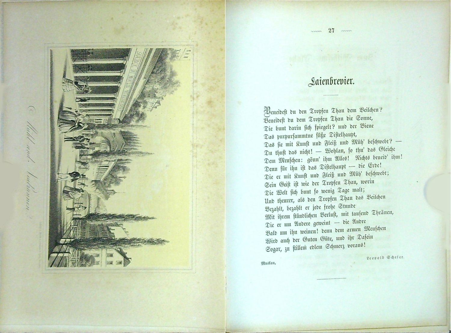 Nebehay 1114<br>Dva díly v jednom svazku. Za str. 96 prvního dílu notový tisk "Choral für Instrumental=Musik und Pianoforte" od Ernsta von Coburg-Gotha a "Lied von Heinrich Heine" od Emila von Wittgensteina. - Celoplátěná dobová ("lipská") vazba s lisovaným ornamentálním zrcadlem na obou deskách olemovaným tlačeným a zlaceným rámečkem, na přední desce uvnitř zrcadla tlačený a zlacený název, ručně šitý kapitálek, dobový papír s ornamentem na předsádkách. - Papír mírně zahnědlý a místy lehce zaprášený, naražené rohy, hřbet při horním okraji lehce naprasklý.<br>V úvodu knihy jsou stručně popsány dějiny města a jeho léčivých pramenů, doplněné a řadu básní se vztahem k místu a zápisů z knihy hostů.