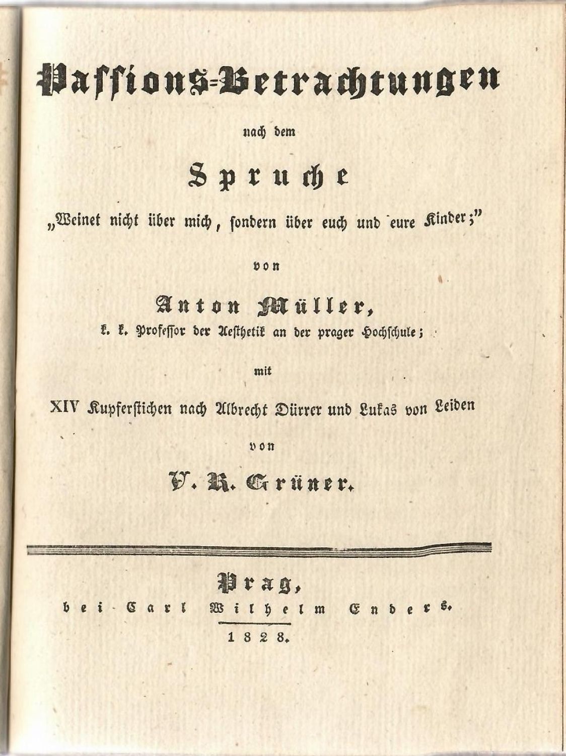 Passions=Betrachtungen nach dem Spruche "Weinet nicht über mich, sondern über euch und eure Kinder;" von .... mit XIV Kupferstichen nach Albrecht Dürrer und Lukas von Leiden von V. R. Grüner.