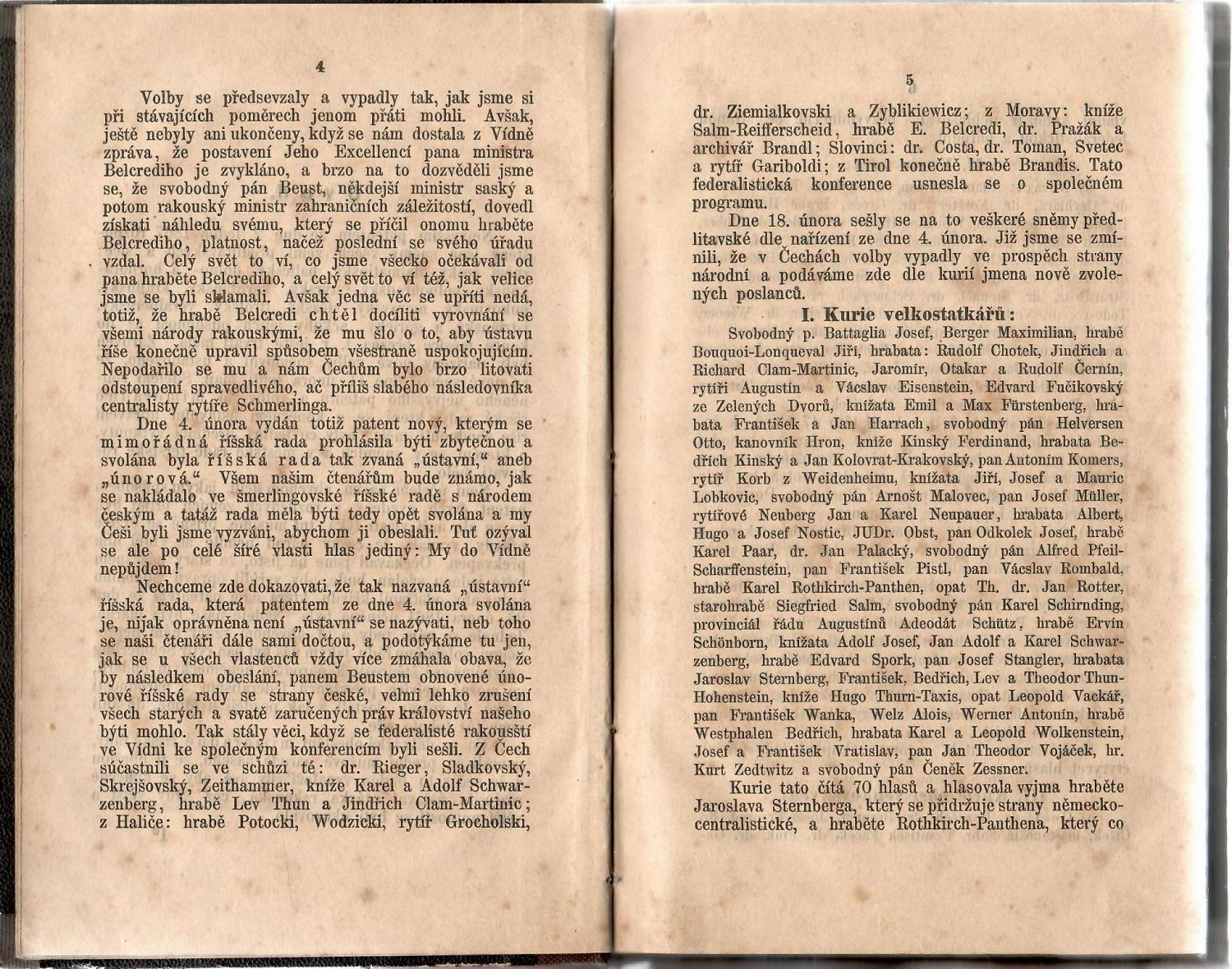 Antikva, na titulním listu dřevoryt s vyobrazením českého zemského znaku.<br>+ přívazek: Müller, Karel "Druhé zasedání sněmu království Českého v měsíci dubnu 1867 a naše šlechta", Praha, Mikuláš a Knapp, 1867, 96 stran, antikva, seznamy hlasující šlechty tištěny ve dvou sloupcích, na tit. listu dřevoryt s českým zemským znakem. <br>Dobová plátěná vazba, černé desky, hnědý hřbet a nárožnice, papír lehce zahnědlý, , místy hnědé skvrny.