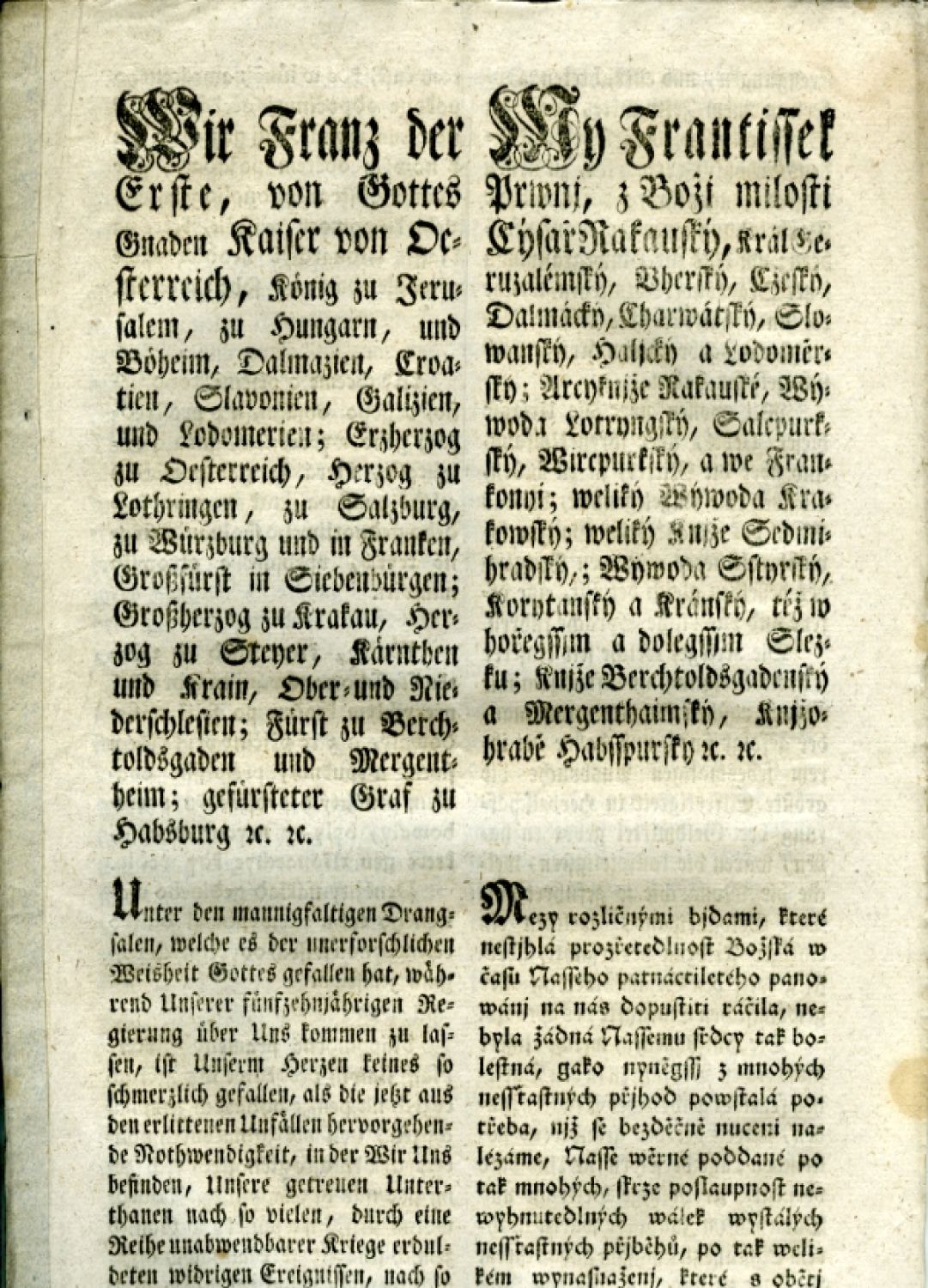My Frantissek Prwnj, z Božj milosti Cýsař Rakauský, ...