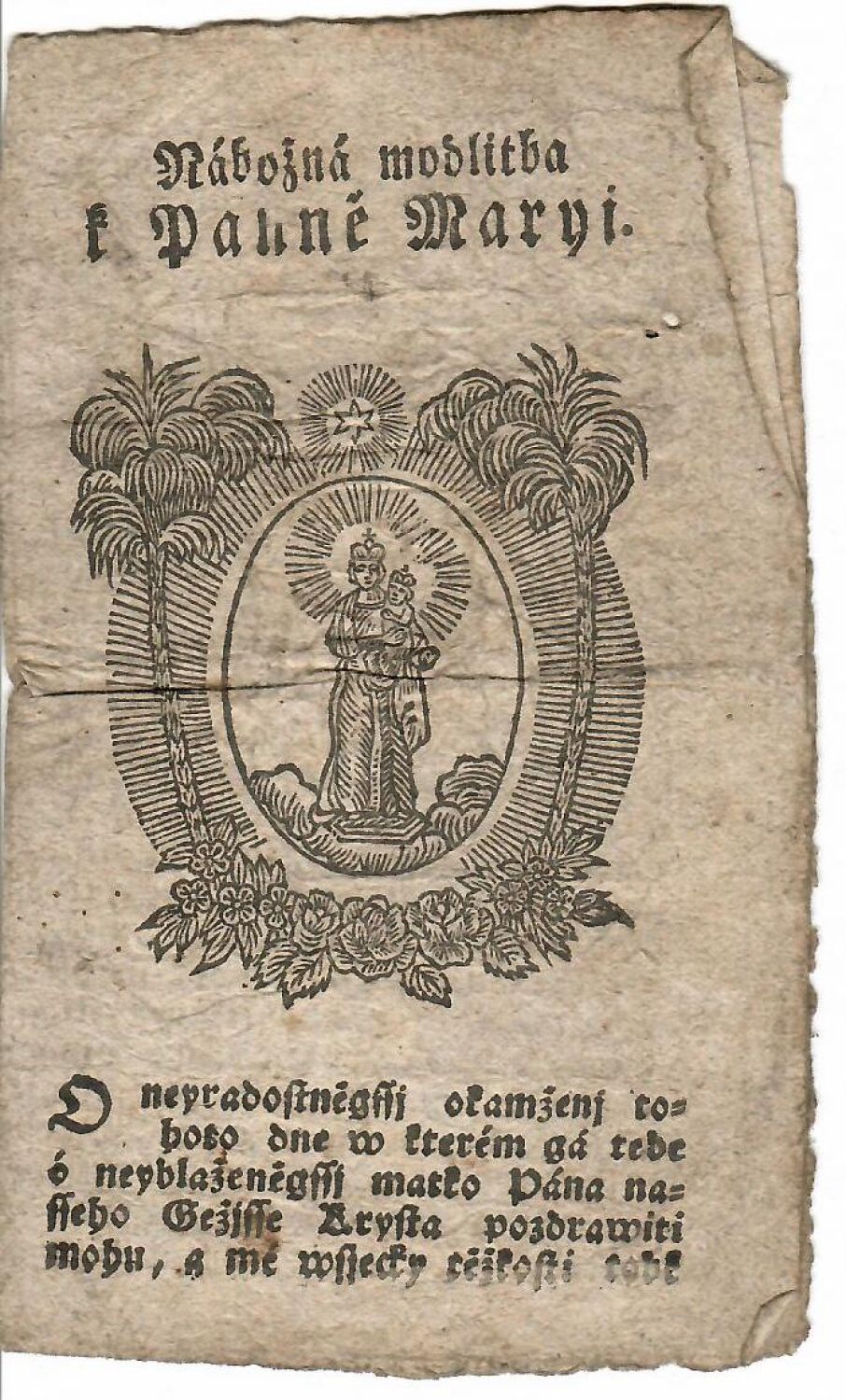 Tištěno frakturou, na líci prvého listu pod názvem dřevoryt (cca 65 x 60 mm) s vyobrazení Panny Marie v oválném medailonu mezi palmovými ratolestmi, koncová mizící linka. - První list při vnějším okraji lehce přeložený.