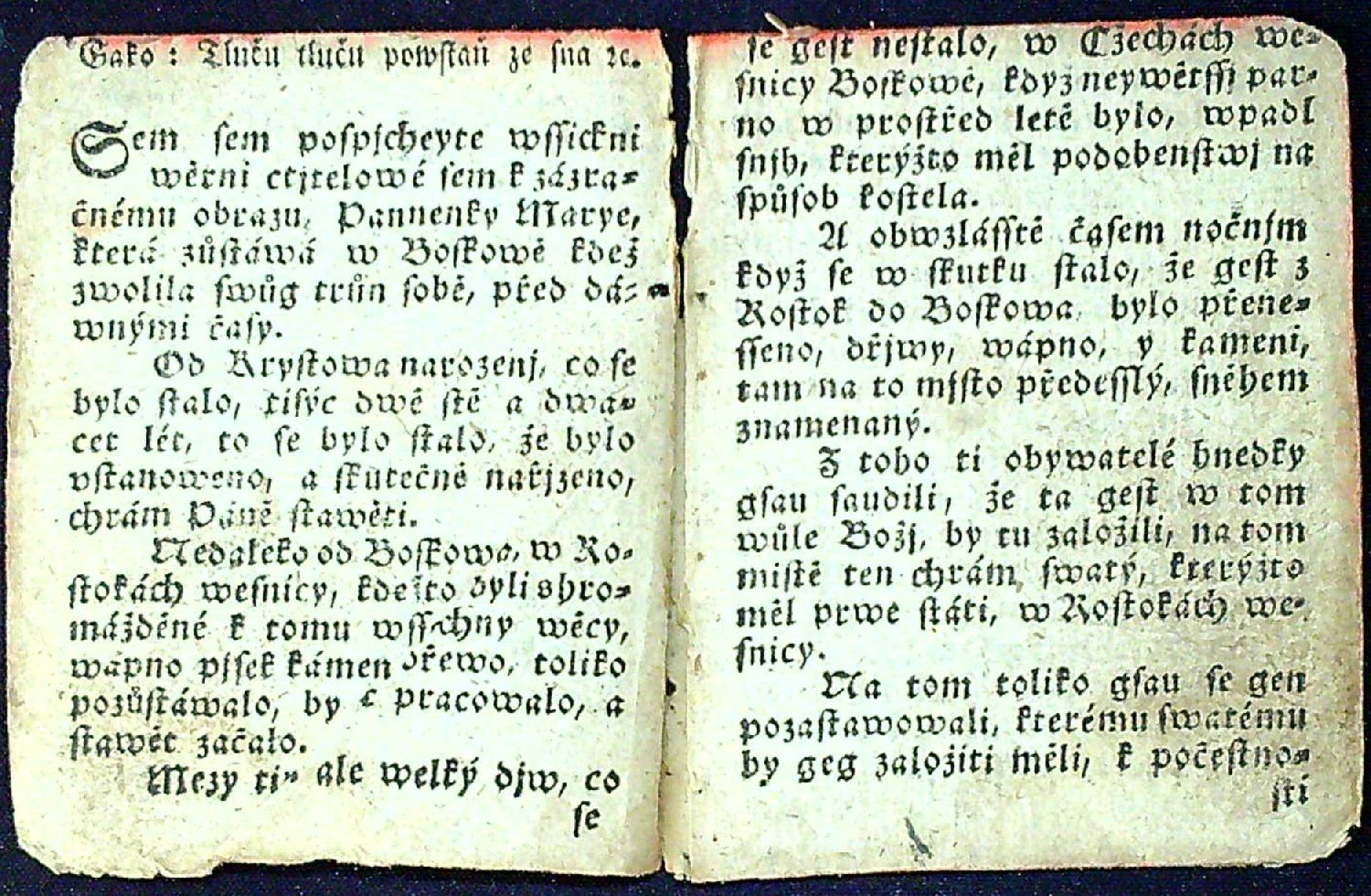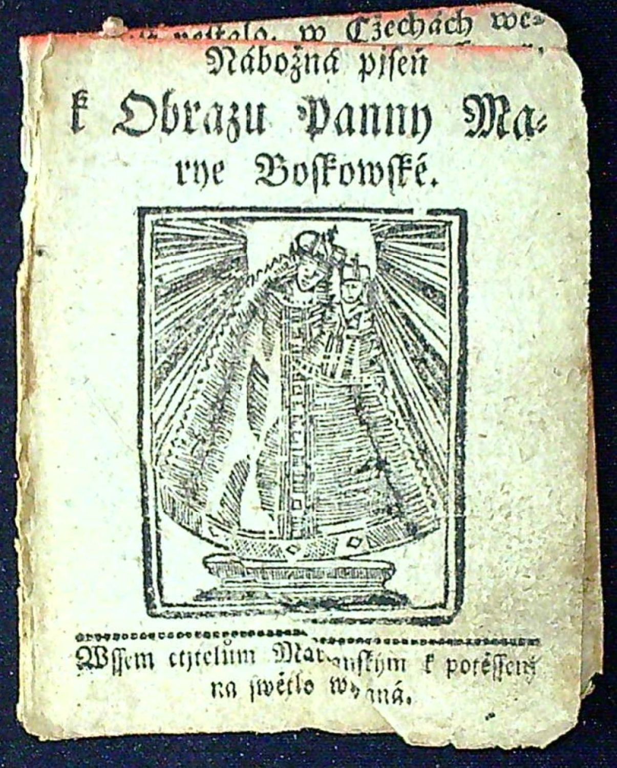 Tištěno švabachem, na tit. listu dřevoryt s vyobrazením Panny Marie Boskovské v jednoduchém rámečku (55 x 43 mm), stránkové kustody, koncová mizící prolamovaná linka. - První list lehce pomačkaný, listy při horním okraji oříznuté po okraj textu. Píseň byla zakoupena ze sbírky významného sběratele Rudolfa Hlavy ze Semil.