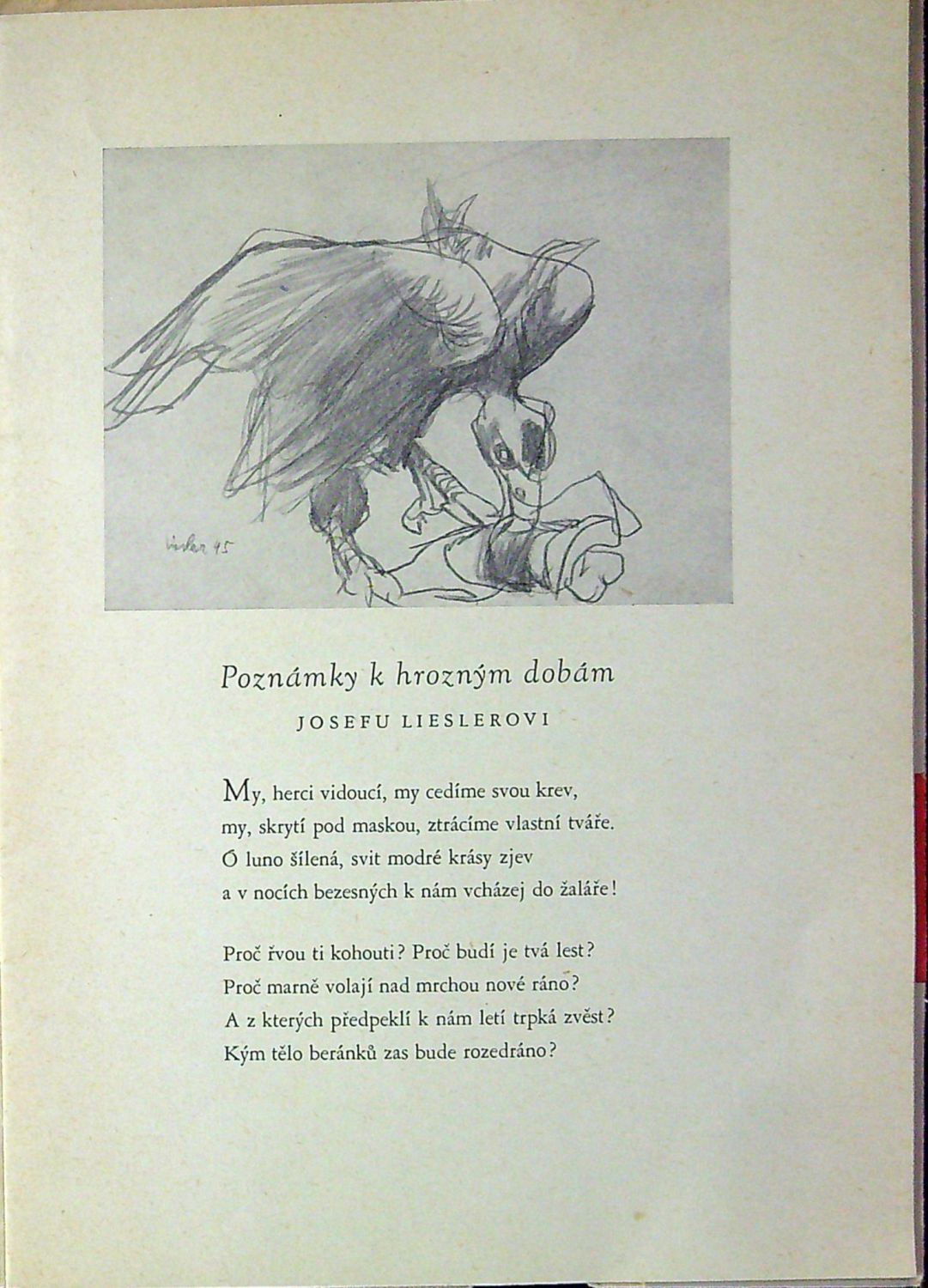 Vydala galerie Jos. R. Vilímek u příležitosti výstavy J. Lieslera. V úvodu báseň Františka Nechvátala, doprovodný text napsal L. Nerad, v textu 6 reprodukcí Lieslerových prací a jeho koncová ilustrace, vzadu seznam 60 vystavených prací. Volně vložen původní Lieslerův lept o rozměru 105 x 75 mm (217 x 146, rozměr celého papíru), autorem uprostřed dole tužkou podepsaný a datovaný 1945.