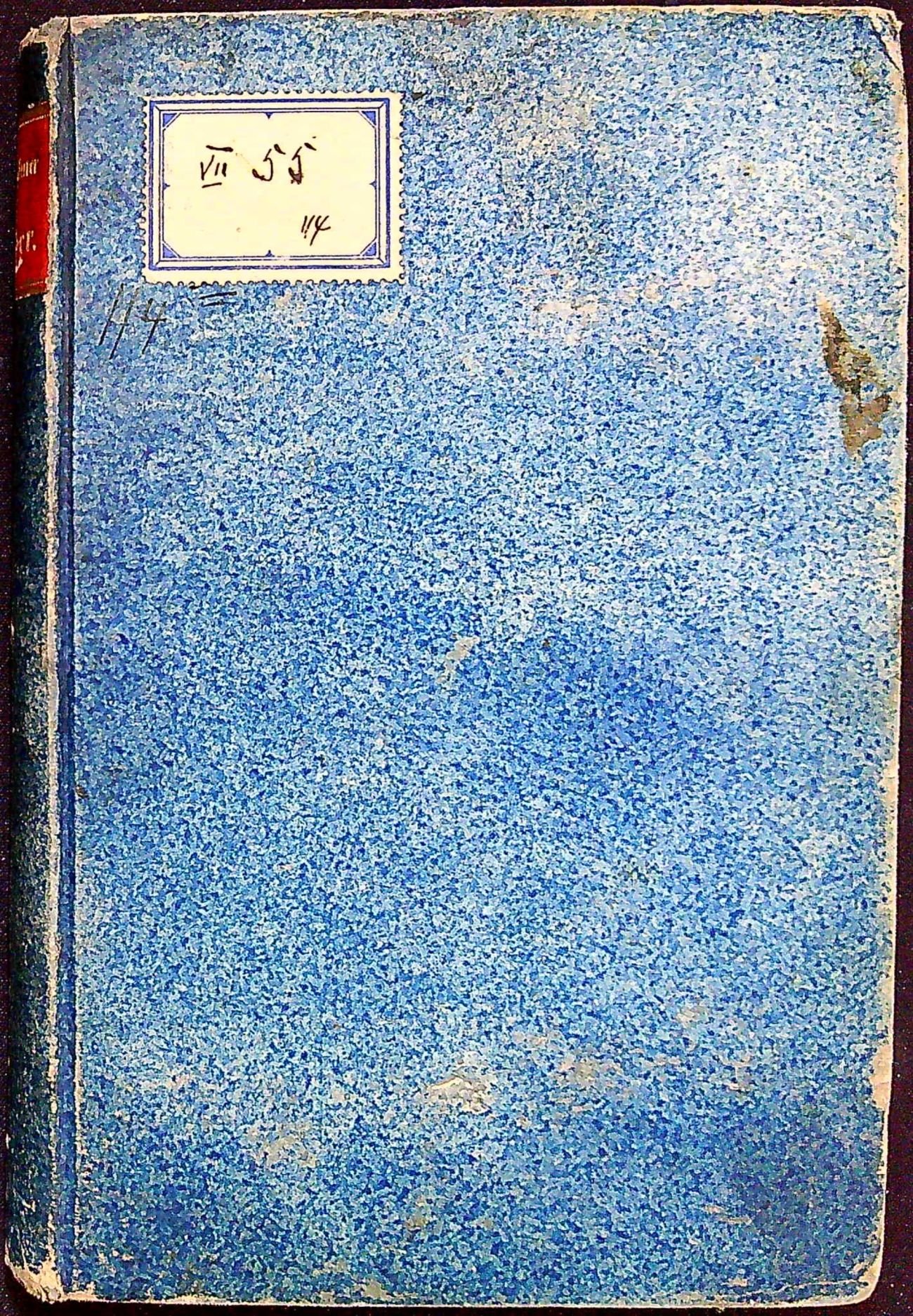 Dobová kartonová vazba potažená mramorovaným papírem, při horním okraji hřbetu světle červený kožený štítek s tlačeným a zlaceným názvem, na přední desce nalepený starý pap. štítek s číslem, na tit. listu nečitelný podpis perem. Vazba lehce ohmataná.
