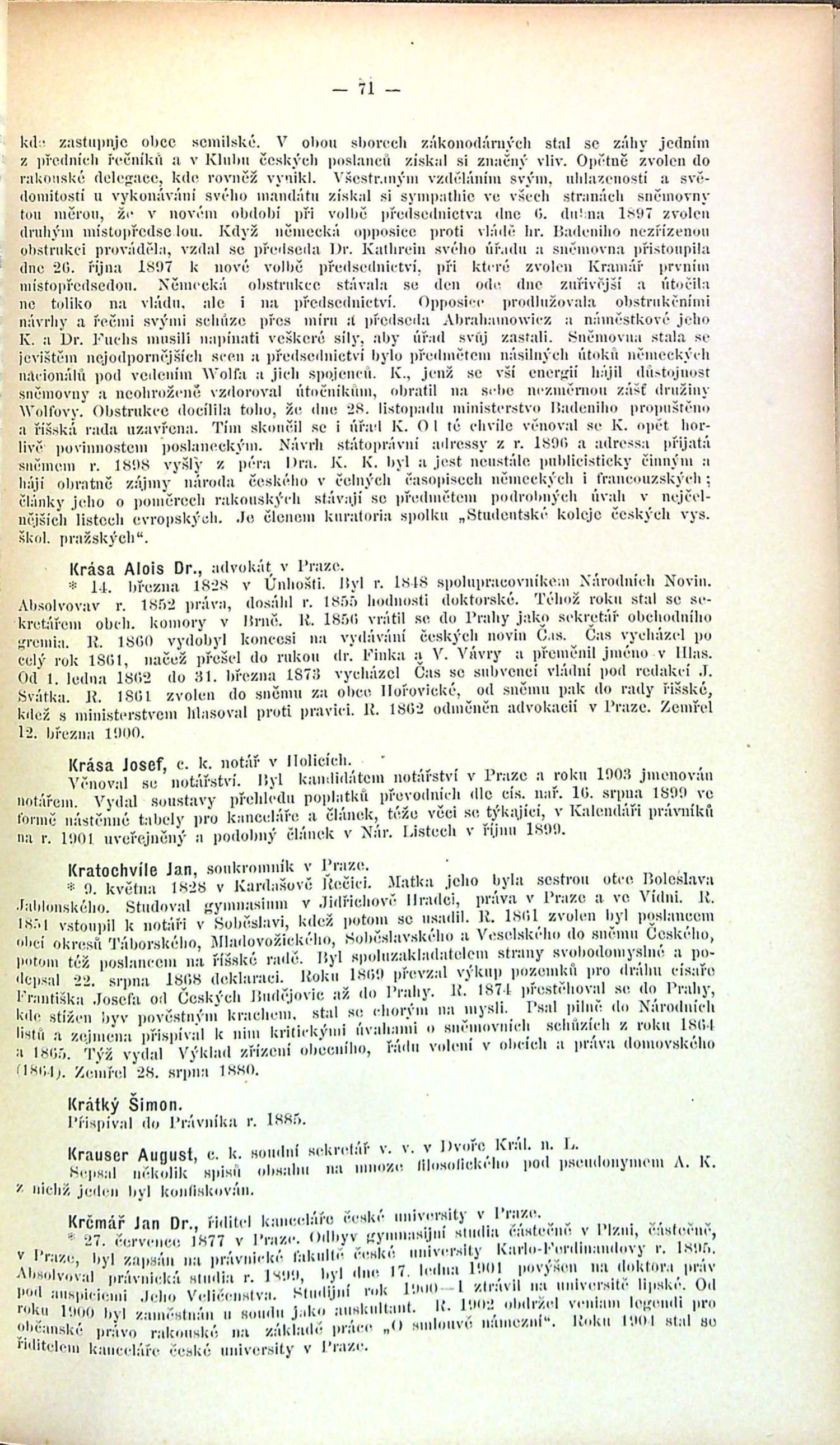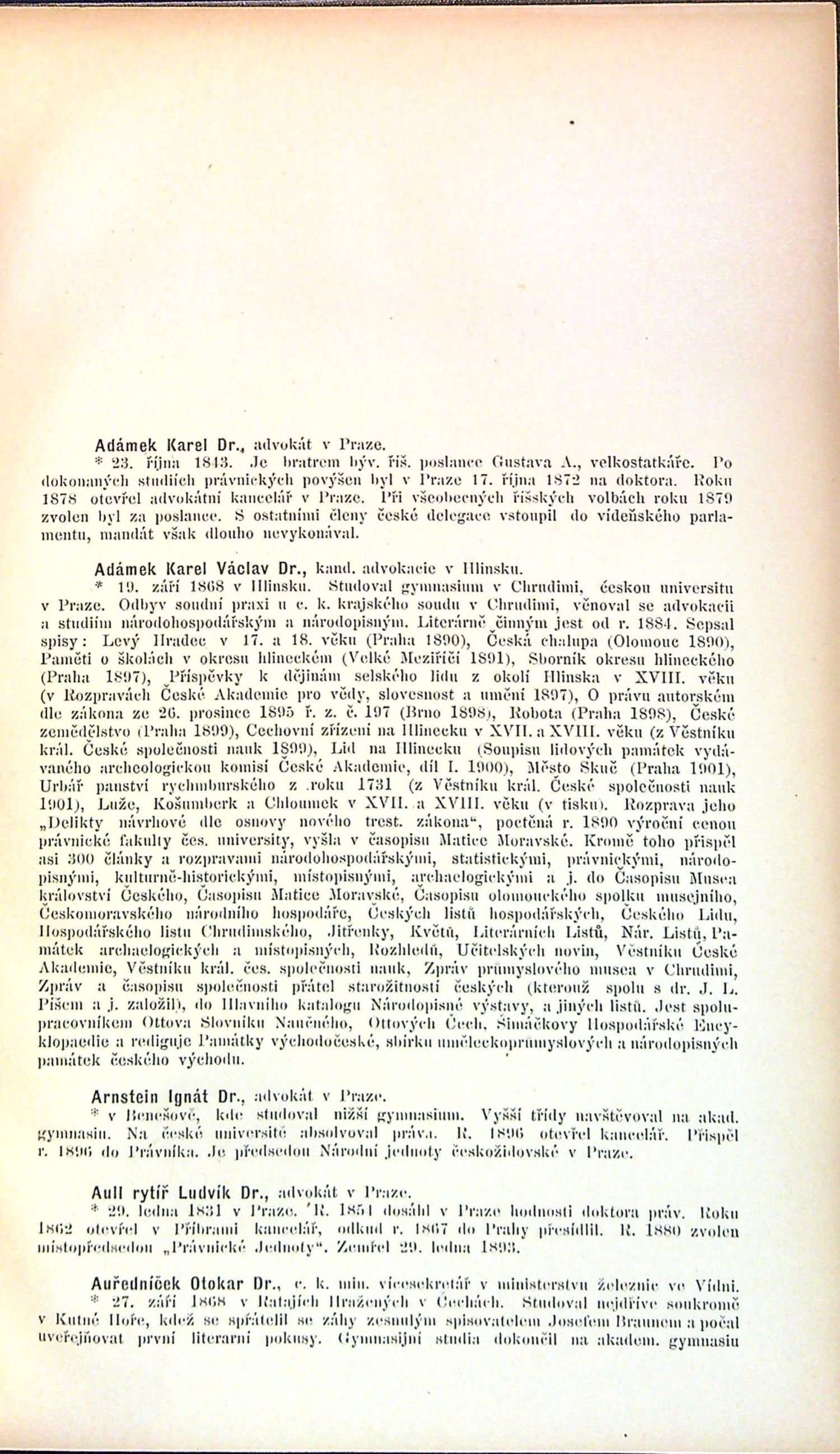Ve front. fotografické vyobrazení dvorního rady a profesora práv na české universitě v Praze Dr. Antonína rytíře Randy, za textem na 25 listech celkem 450 fotograf. portrétů právníků a dalších představitelů českého veřejného života 19. století. V textu 600 životopisů.