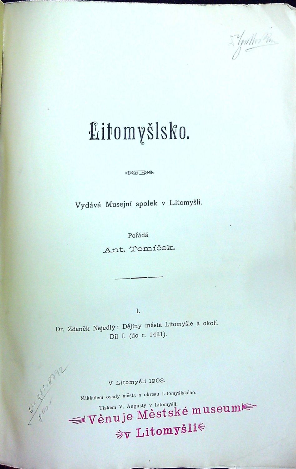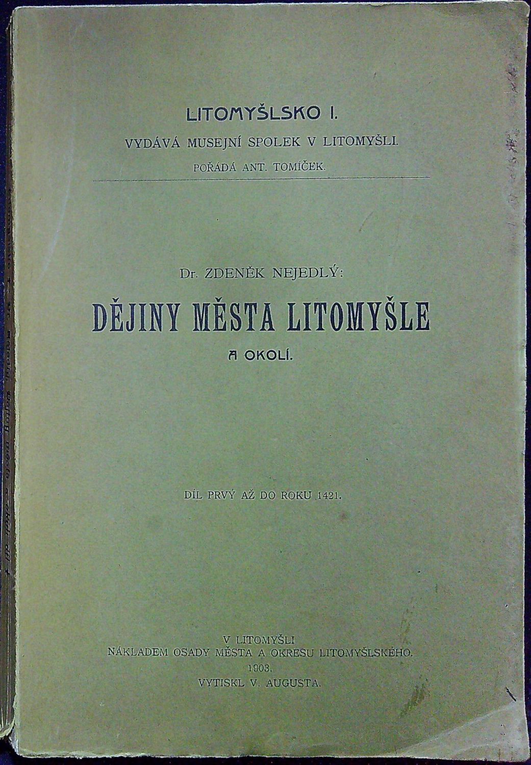 Nejedlý měl v úmyslu napsat dějiny města až do roku 1860, práci však nedokončil, jako ostatně všechna svá díla. - Na tit. listu staré razítko "Věnuje Městské museum v Litomyšli". - Při spodním okraji hřbetu lehce natržený pap. pokryv hřbetu.