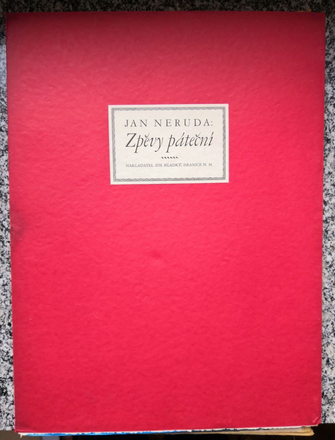 Ex. č. 9 z 225 vydaných a tištěných na italském ručním papíře Fabriano, Konůpkovy lepty vytiskl Alessandro de Pian v Praze, text podle osnovy Karla Dyrynka písmem Fournierovým vytiskla Státní tiskárna v Praze. V tiráži tužkou podpisy Jana Konůpka, Josefa Hladkého a Karla Dyrynka. - Původní obálka s červeným přebalem s chlopněmi, na přední straně papírový štítek s věcným názvem, na předsádkách modře barvený papír. Původní kartonové ochranné pouzdro, odřené a při horním i spodním kraji natržené, kniha samotná ve stavu intaktním.
