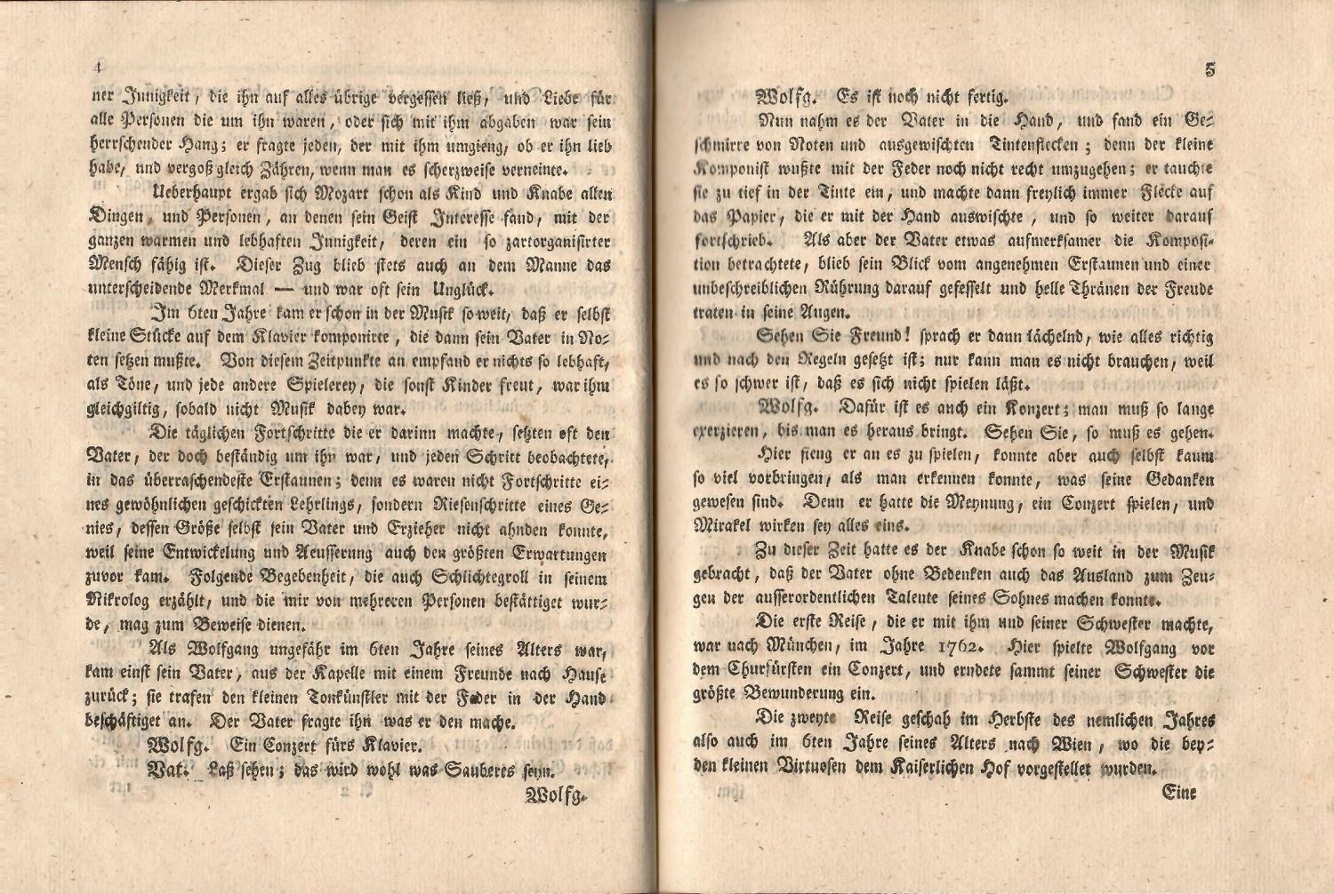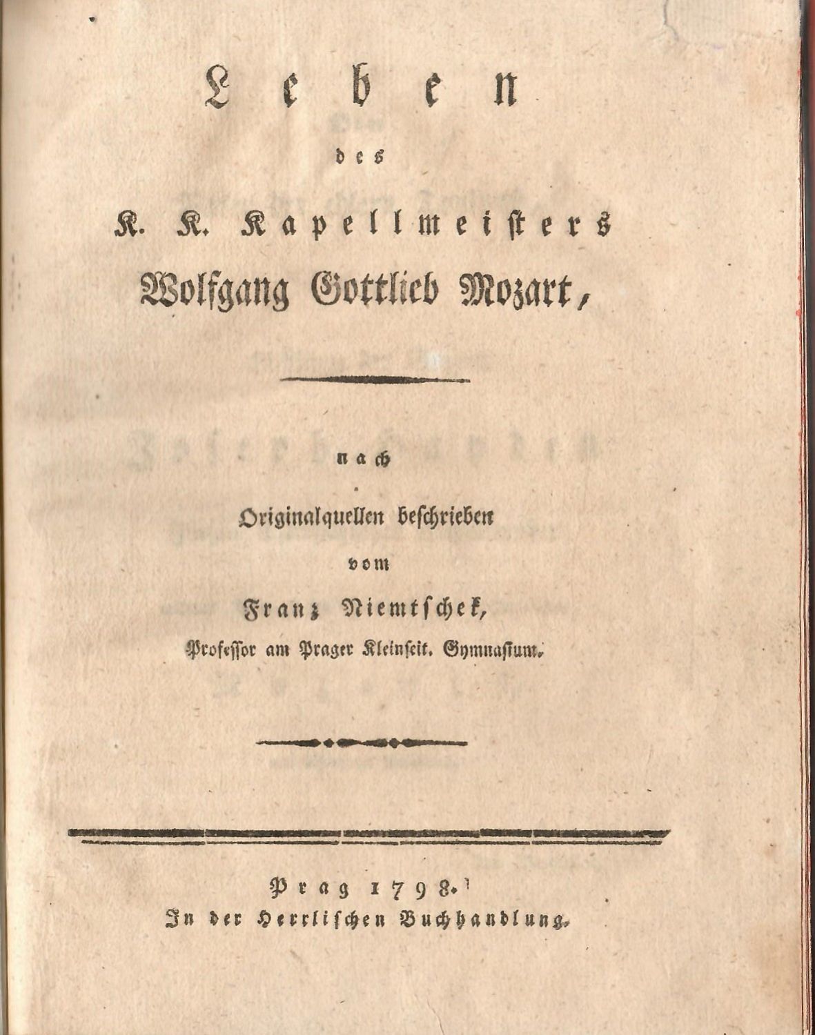 BCBT 07474 (eviduje 1 ex. v NK v Praze), SKC eviduje dva ex. v NK v Praze.<br>Tištěno švabachem, latinská slova antikvou, tištěné poznámky pod čarou, jednoduché linky. - Dobová vazba s kartonovými deskami potaženými škrobovým papírem, kožený hřbet a nárožnice, ve hřbetu pět vazů, ve druhém poli světle červený původní kožený štítek s tlačeným a zlaceným názvem, v ostatních polích tlačený a zlacený rostlinný ornament, červeně barvené ořízky, na přídeštích a předsádkách dobový tragantový papír. - Velmi vzácně na trhu se objevující první monografie W. A. Mozarta.<br>František Xaver Němeček (24.7. 1766 Sadská - 19.3. 1849 Vídeň) český filosof, literární a hudební teoretik. Vystudoval filosofii na Karlově universitě v Praze, kde získal doktorát. Od roku 1802 řádný profesor na Karlově universitě, kde přednášel teoretickou a praktickou filosofii. Od roku 1820 přednášel na universitě ve Vídni. Od roku 1787 dle svého tvrzení přítel W. A. Mozarta (neexistují však přímé důkazy a v poslední době je jeho tvrzení zpochybňováno). Po smrti Mozartově však získal od vdovy Constanze řadu dokumentů pro svůj výzkum na základě kterého vznikla první Mozartova monografie, později se stal soukromým učitelem jeho synů Karla a Wofganga, kteří u něj po nějaký čas bydleli v jeho domě na Malé Straně.