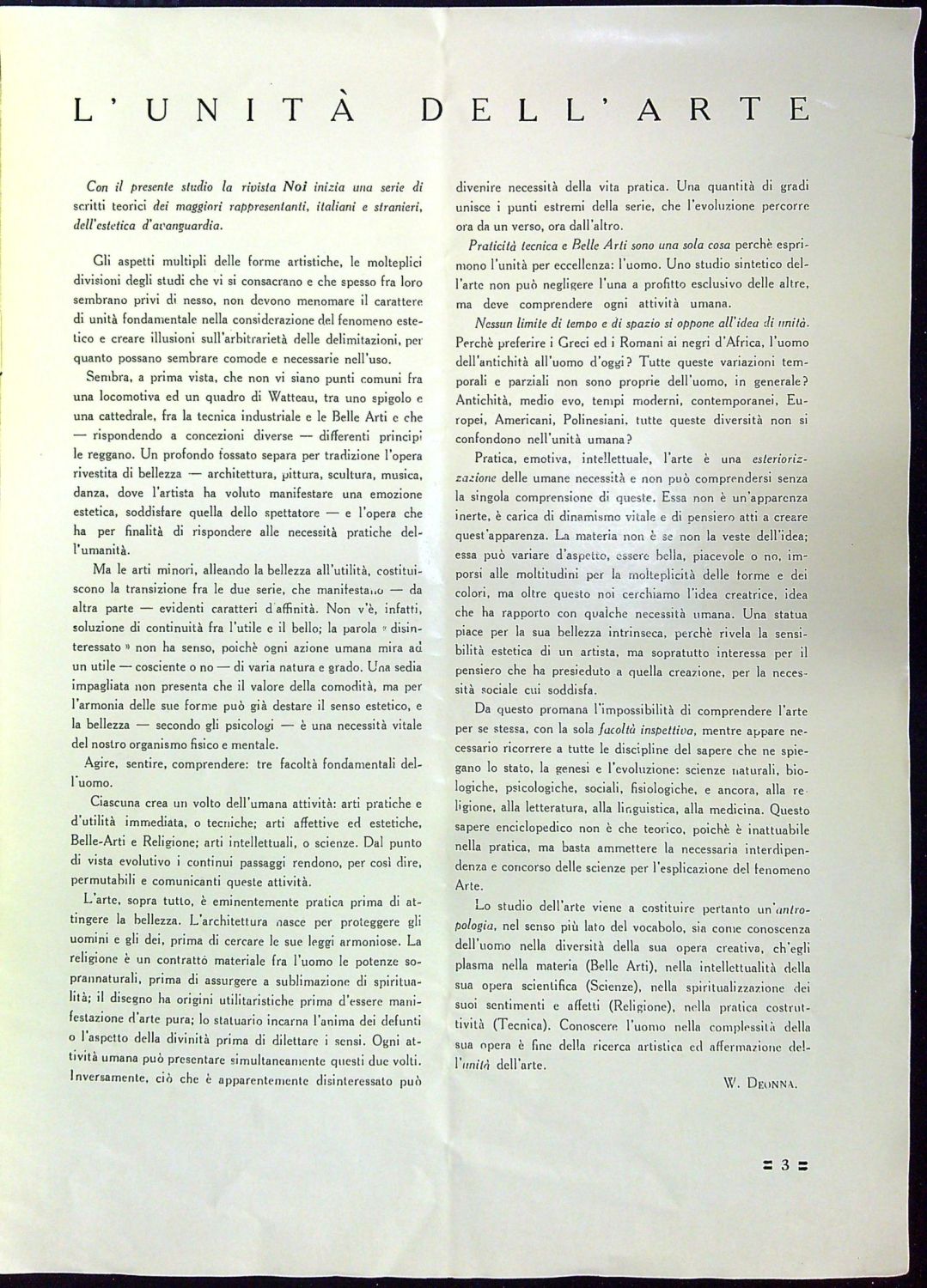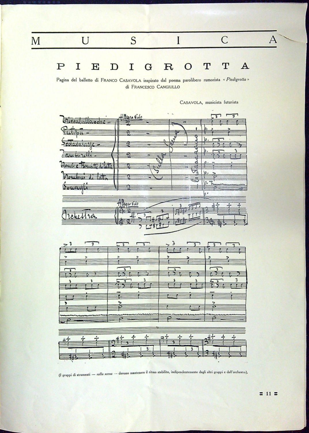 V textu 11 černobílých reprodukcí obrazů (Balla, Prampolini, Deoero, Marasco, Pettoruti, Idelson, Belzova, Miklos, Mohr a Nagano - dva obrazy), na jedné straně faksimile (ukázka notace futuristického baletu od Franca Casavola), úvodní text Marinettiho a ukázka jeho hudební produkce na text francouzského básníka Nicolase Beaduina. <br>Původní sešit o rozměru 345 x 245 mm s dvoubarevně tištěnou obálkou (modro-černou), uprostřed svisle mírně přeložený a při pravém horním okraji natržený v šíři cca 3 cm, na zadní straně reklamy na různé evropské avantgardní časopisy (z Čech na Disk).<br>Jedno číslo slavného a velmi vzácného italského futuristického časopisu, který vycházel v letech 1917-1925 pod redakcí Enrica Prampoliniho.
