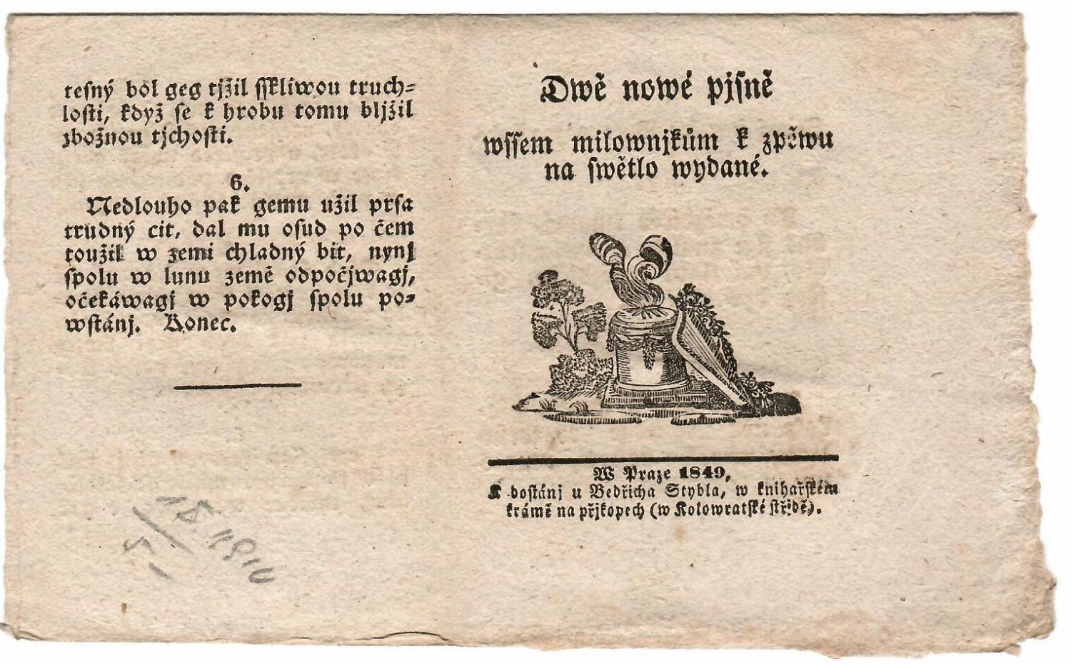 Tištěno švabachem, první píseň má 6 arabsky číslovaných strof, druhá též 6 strof, na obou titulních listech dřevorytové viněty, koncové mizící linky. První píseň bez impresa, druhá s impresem pod jednoduchou linkou. - Nerozřezáno, druhá píseň neoříznutá.