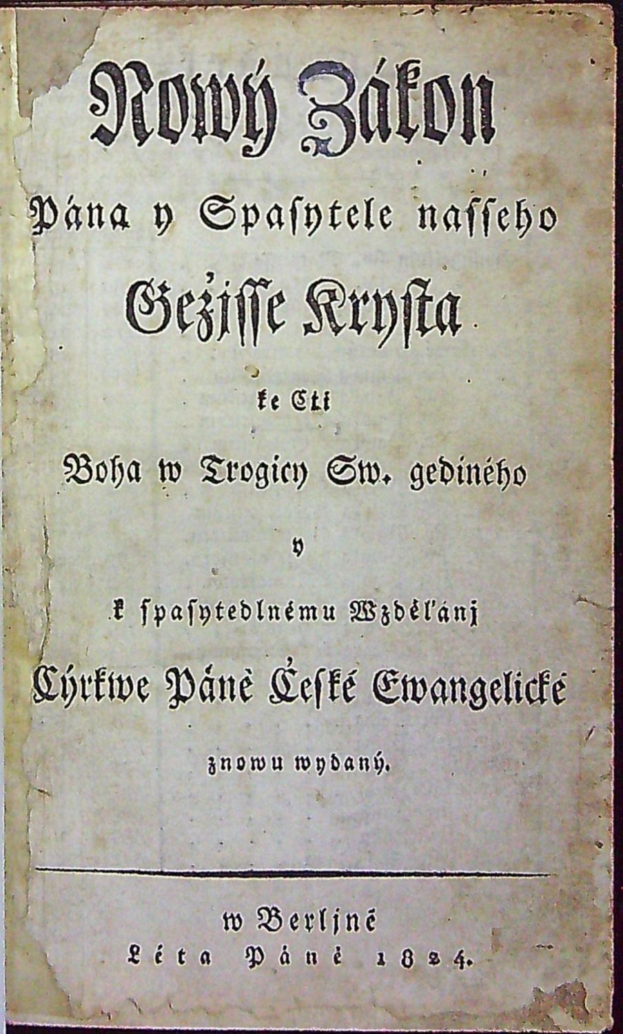 Nowý Zákon Pána y Spasytele nasseho Gežjsse Krysta ke Cti Boha w Trogicy Sw. gediného y k spasytedlnému Wzděľánj Cýrkwe Páně České Ewangelické znowu wydaný.