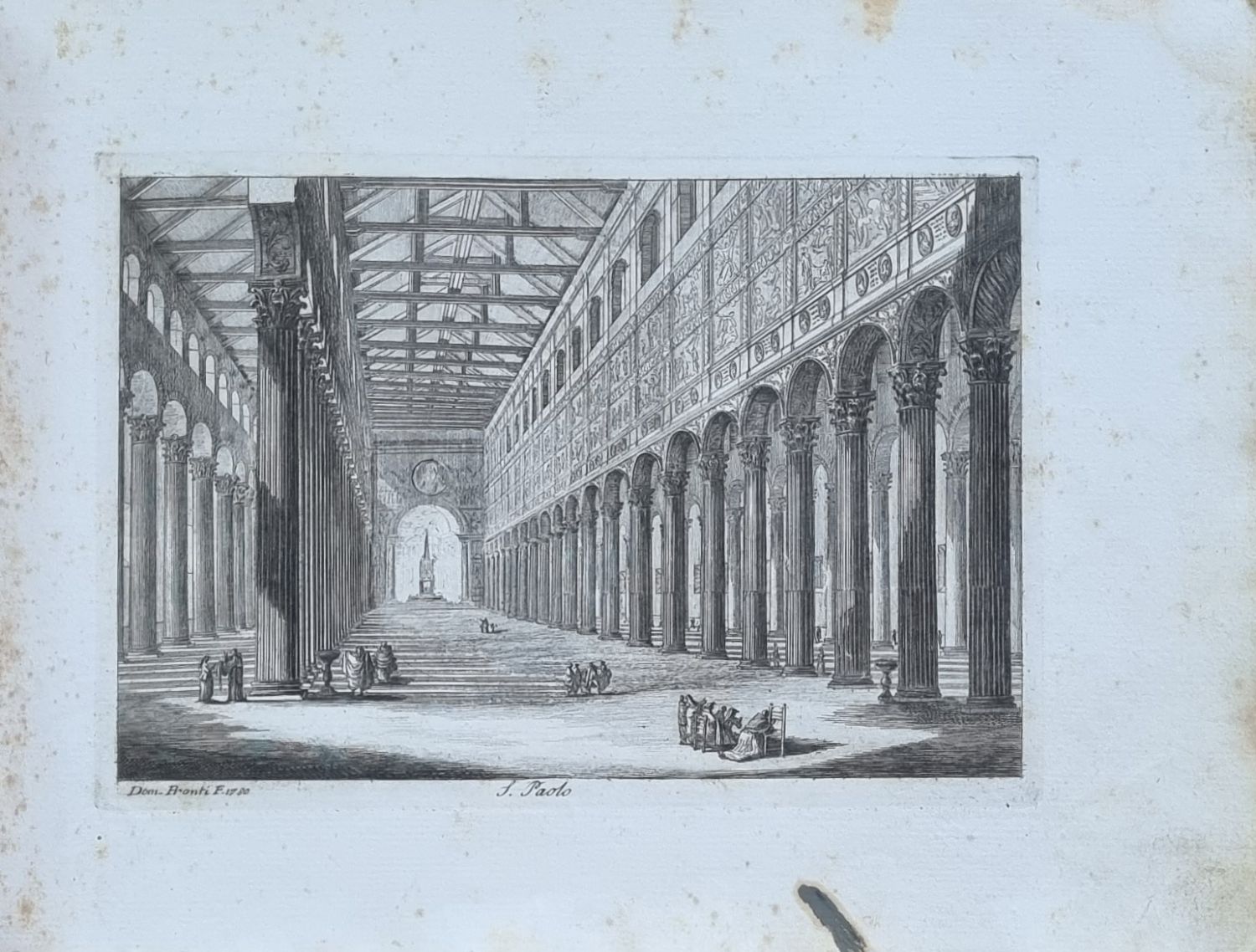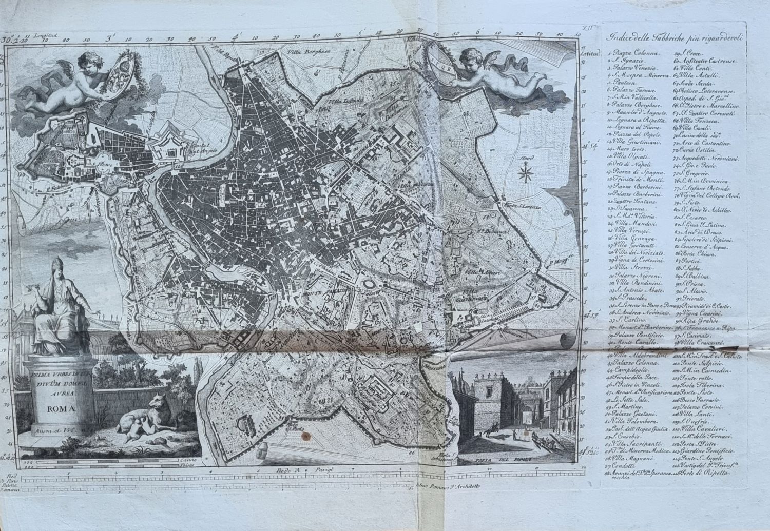 Před tit. listem rozkládací plán Říma s kartušemi a rozkládací mapa provincie Roma od Domenica Prontiho datovaná 1782, za titulním listem 52 mědirytin s vedutami různých římských pamětihodností, plány, obelisky, vyobrazeními antických plastik a portrétů .... od F. Morela, Ferrettiho, Chosarda, Scarla, Parboniho.<br>Dobová pap. obálka z olejového papíru při okrajích a ve hřbetu potrhaná, papír místy zahnědlý, na tit. listu a několika dalších listech světle hnědé mapy od vlhkosti. Rozměr knižního bloku 205 x 288 mm.