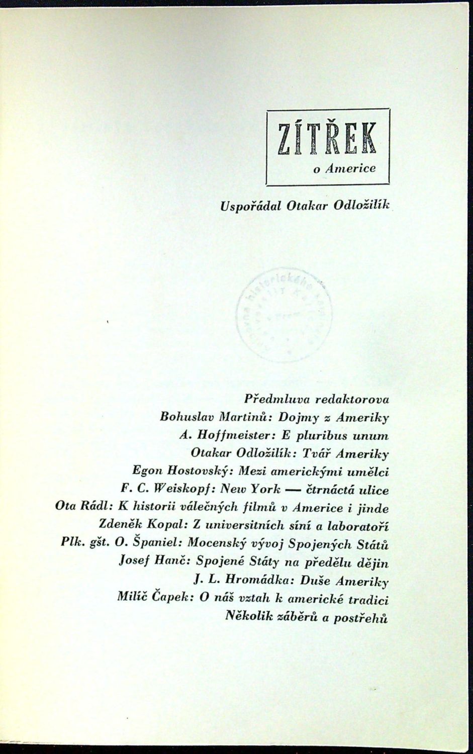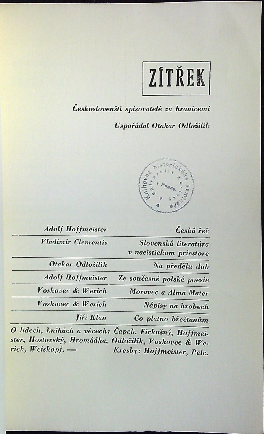 Vytiskla tiskárna New Yorského deníku. Ve druhém čísle dvě reprodukce kreseb A. Hoffmeistera a A. Pelce, v čísle třetím front. od A. Pelce. Ve sbornících příspěvky od A. Hoffmeistera, Voskovce a Wericha, J. Ježka, E. Hostovského, B. Martinů, V. Clementise, O. Odložilíka, ... - Původní pap. obálky, mírně zaprášené, při horním okraji přední strany obálek nalepen malý, čistý pap. štítek. Na tit. listech staré razítko z doby těsně poválečné "Knihovna historického semináře UK v Praze". Oslí uši. - Kompletní ročníky sborníku "Zítřku" (více čísel nevyšlo).