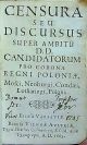 CENSURA SEU DISCURSUS SUPER BAMBITU D. D. CANDIDATORUM PRO CORONA REGNI POLONIAE. Mosci, Neoburgi, Condaei, Lotharingi, Poloni. Excusa Varsaviae. Recusa Vienna Avstriae.