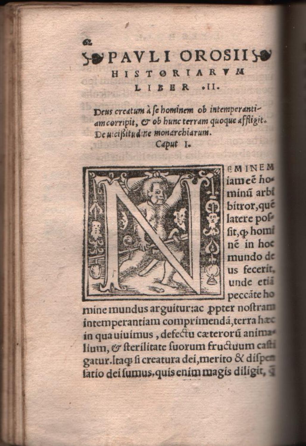 Titulní list částečně tištěný versálkami, na tit. listu dřevořezová viněta, živá záhlaví, tištěné poznámky po stranách, plné iniciálky zalomené do výše dvou řádků, několik konturových iniciál v rámečku na pozadí nábožensko-symbolického obsahu zalomených do výše 4,7,8 a 9 řádků, na str. 62 velká obrysová iniciála s mladým bojovníkem v pozadí zalomená do výše 11 řádků, na str. 183 s mladíkem držícím v ruce ratolest též zalomená do výše 11 řádků.<br>Dobová tlačená renesanční vazba z bukových destiček potažených hnědou hovězinou, na přední desce dvojité zrcadlo, při jeho horním okraji tlačené jméno autora knihy, v rámu zrcadla biblické výjevy a latinské opakující se nápisy, uvnitř zrcadla výjevy náboženského obsahu, na zadní desce je rám dvojitého zrcadla tvořen kulatými medailonkami s portréty, které jsou od sebe oddělené rostlinným dekorem, uvnitř zrcadla biblické výjevy. Ve hřbetu čtyři vazy, na přední desce dva původní kovové úchyty, na zadní desce zbytky kování pro uchycení spon, které chybí. Vazba ohmataná a odřená, při horním okraji hřbetu až po druhý vaz potrhaná, na zadní desce při kování a ve spodním okraji rámu chybí kousky kůže. Na tit. listu provenienční záznam z roku 16O4 Rudolph Wassermann, Olomouc 1604), druhý je přeškrtaný a nečitelný, na předním přídeští rkp. poznámky perem ze 17. století, v textu též několik poznámek ze stejné doby.<br>Paulus Orosius (cca 375 pravděpodobně Braga - po 418), historik a teolog, žák sv. Augustina, spolupracovník sv. Jeronýma. Autor tří knih, ze kterých je nejvíce ceněné námi nabízené dílo, ve kterém se autor pokusil o sepsání dějin světa od Adama. Jedná se o první dějiny světa sepsané křesťanem. V knize se autor mimo jiné pokusil vyvrátit argumenty názor, že pád Říše římské způsobilo přijetí křesťanství. Historickou hodnotu knihy mají však pouze místa popisující události po roce 378.