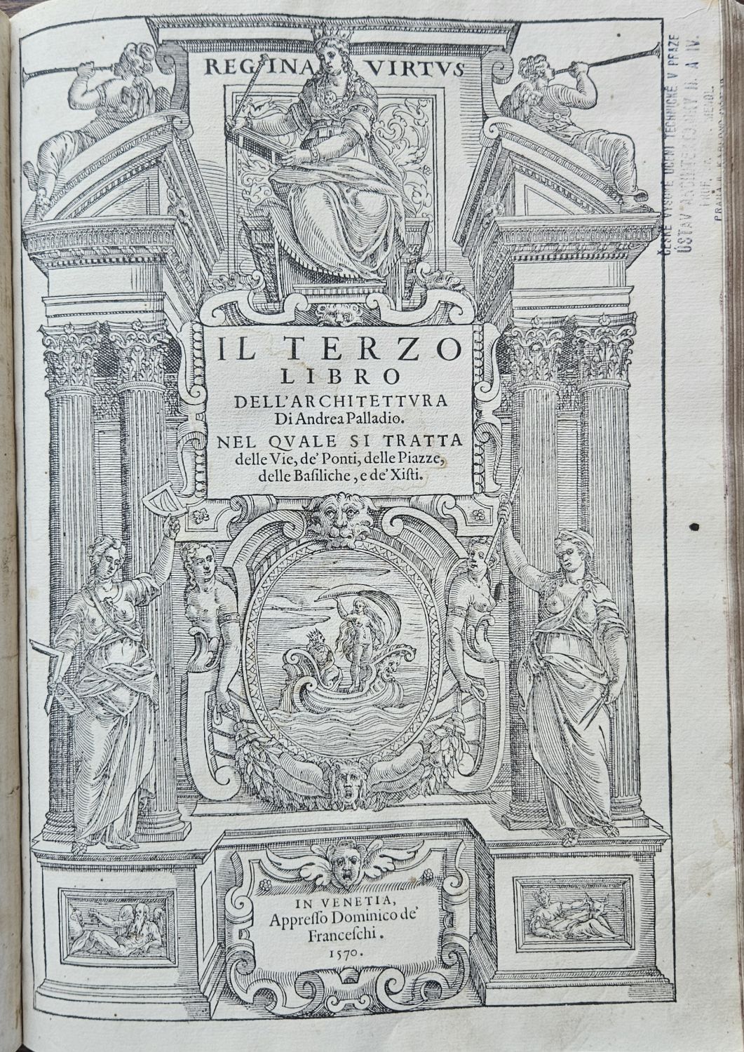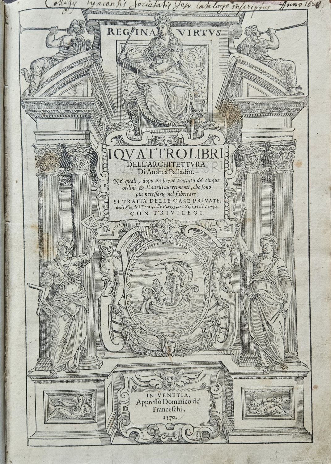 I QVATTRO LIBRI DELL´ARCHITETTVRA Di Andrea Palladio. Ne´ quali, dopo un breue trattato de´ cinque ordini, et di quelli auertimenti, che sono piu necessarij nel fabricare; SI TRATTA DELLE CASE PRIVATE, delle Vie, i Ponti, delle Piazze, de i Xisti, et de´ Tempij. CON PRIVILEGII.