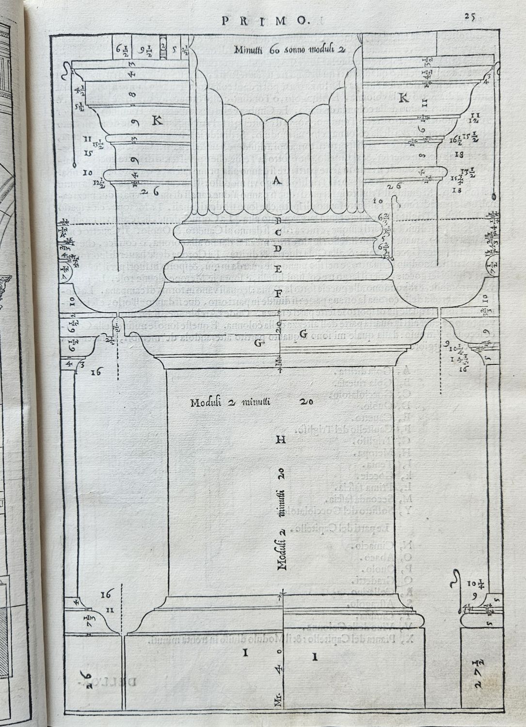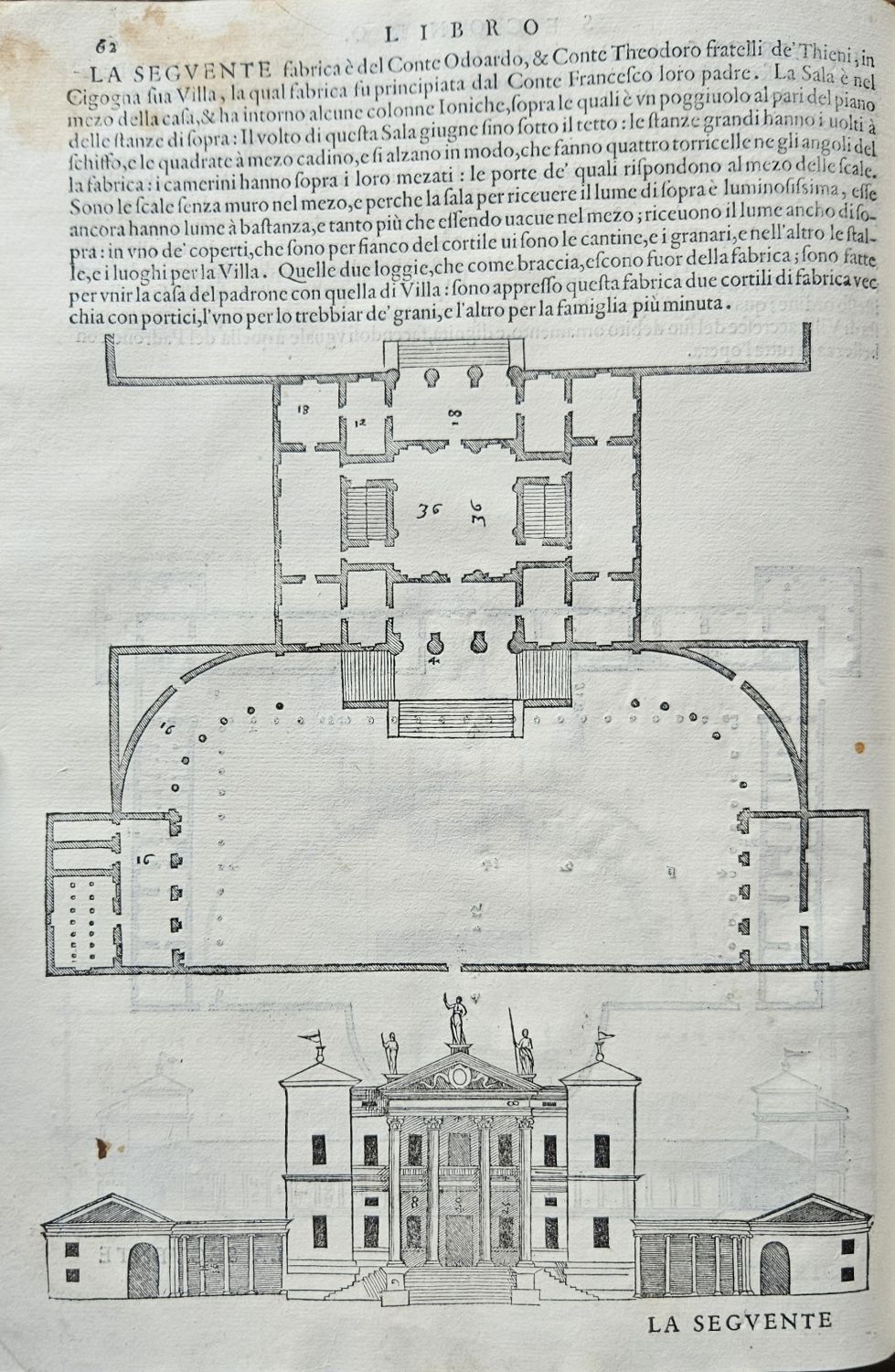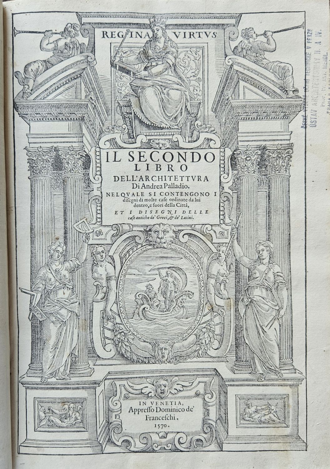Řada konturových iniciál v jednoduchém rámečku na ilustrativním pozadí zalomených do výše 6 řádků, v kolofonu 4. knihy signet tiskařův.<br>Kartonová vazba (298 x 215 mm) potažená tmavým plátnem z konce 19. století. Vazba ohmataná, zadní deska zčásti odřená, naražené rohy. Na titulním listu starý provenienční přípis "Collegii Lyncensis Societatis Jesu Catalogo inscriptus Anno 1628", na předním přídeští knih. papírový štítek s číslem a datem 1910, na přední předsádce, poslední straně 4. knihy a spodní ořízce razítko z 30. let 20. století České učení technické v Praze Ústav architektoniky II. a IV. Prof. Dr. Ant. Mendl", při spodním okraji třetí strany 1. knihy staré razítko "Vysoká škola architektury a pozemního stavitelství Ústav architektoniky II. a IV.".<br>Andrea Palladio (30.11. 1508 Padova - 19.8. 1580 Maser u Trevisa), jeden z nejslavnějších a nejvlivnějších pozdně renesančních architektů a teoretiků architektury. Nabízené dílo je první a kompletní vydání stěžejní autorovy knihy, která navazuje na Vitruvia, kterého autor považoval za svého učitele. Dílo je rozděleno do čtyř částí. První kniha obsahuje 29 kapitol a pojednává o přípravě staveb, stavebním materiálu, kvalitě půdy pro základy stavby, druzích zdí a jejich vlastnostech, stavebních slozích a podrobnému popisu vnitřních částí stavby. Druhá kniha obsahuje 17 kapitol věnovaných vybraným detailům významných staveb minulosti i současnosti. Třetí kniha se skládá z 21 kapitol a přináší údaje o autorových cestách, údaje o členění měst, ulicích, náměstích a basilikách, věnuje zvýšenou pozornost mostům s ukázkami staveb antických, ale také s návrhy staveb mostů autorových. Čtvrtá kniha má 31 kapitol a je věnována popisu staveb chrámů a místa pro jejich postavení s ukázkami významných chrámů tehdejší doby. V knize je i řada Palladiových plánů, které nemohly být z nejrůznějších důvodů realizovány, a které pak později inspirovaly řadu jiných architektů.