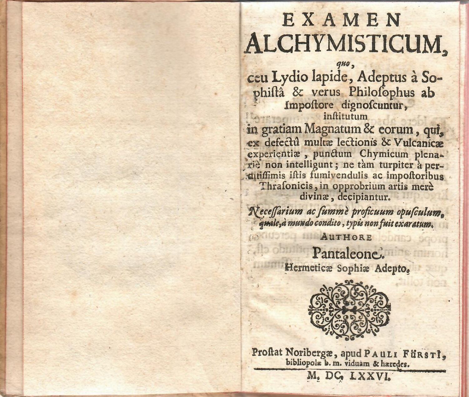 EXAMEN ALCHYMISTICUM, quo ceu Lydio lapide, Afdeptus a Sophista & verus Philosophus ab Impostore diagnoscuntur, institutum in gratiam Magnatum & eorum, qui, ex defectu multae lectionis & Vulcanicae experientiae, punctum Chymicum plenarie non intelligunt; ne tam turpiter a perditissimis istis fumivendulis ac impostoribus Thrasonicis, in opprobrium artis mere divinae, decipiantur. Necessarium ac summe proficuum opusculum, quale, a mundo condito, typis non fuit exaratum.n