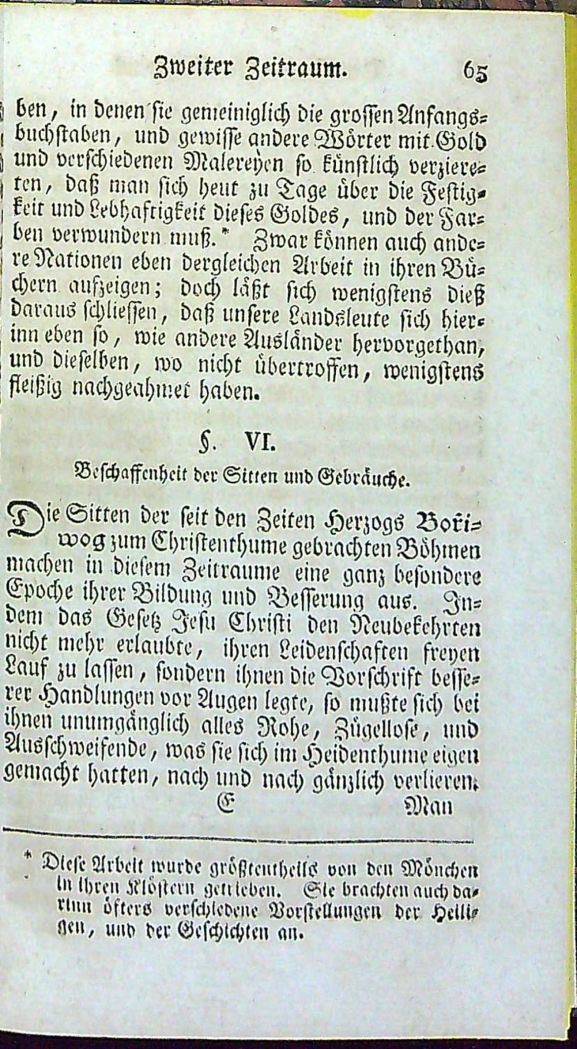 Knihopis 6910<r>Německý text a česká slova gotikou, signatury, stránkové kustody, arabské číslování stran při horním vnějším okraji, živá záhlaví, poznámky pod čarou, dřevořezové vlysy rostlinného dekoru, viněty, iniciály zalomené do výše 2 řádků, v textu 4 rozkládací přílohy (synchronistické tabulky), na titulním listě mědirytinová viněta.<br>Kartonová vazba potažená olejovým papírem, při horním okraji hřbetu temně zelený kožený štítek s tlačeným a zlaceným názvem. Listy od strany 239 až do konce pomačkané, na tit. listu nalepený proužek papíru přes pravděpodobně natržený papír (zasahuje při pravém horním okraji do viněty). Chybí mapa Král. českého.<br>Aleš Vincenc Pařízek (15.11. 1748 Praha - 15.4. 1822 Praha). Kněz, člen řádu Dominikánů, významný pedagog. Od r. 1790 ředitelem vzorové hlavní školy na Malé Straně v Praze. Navazuje na Felbigerovo osvícenské a filantropické pojetí, představitel jazykového školního utrakvismu.